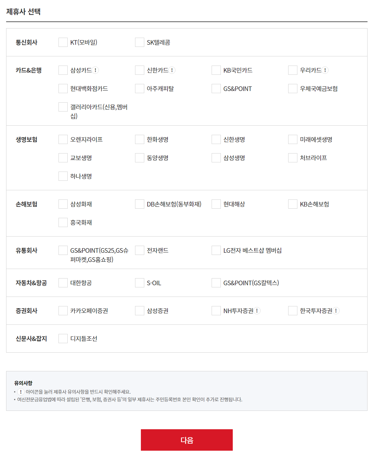 인증을 하면, 이렇게 제휴사 리스트가 보입니다.