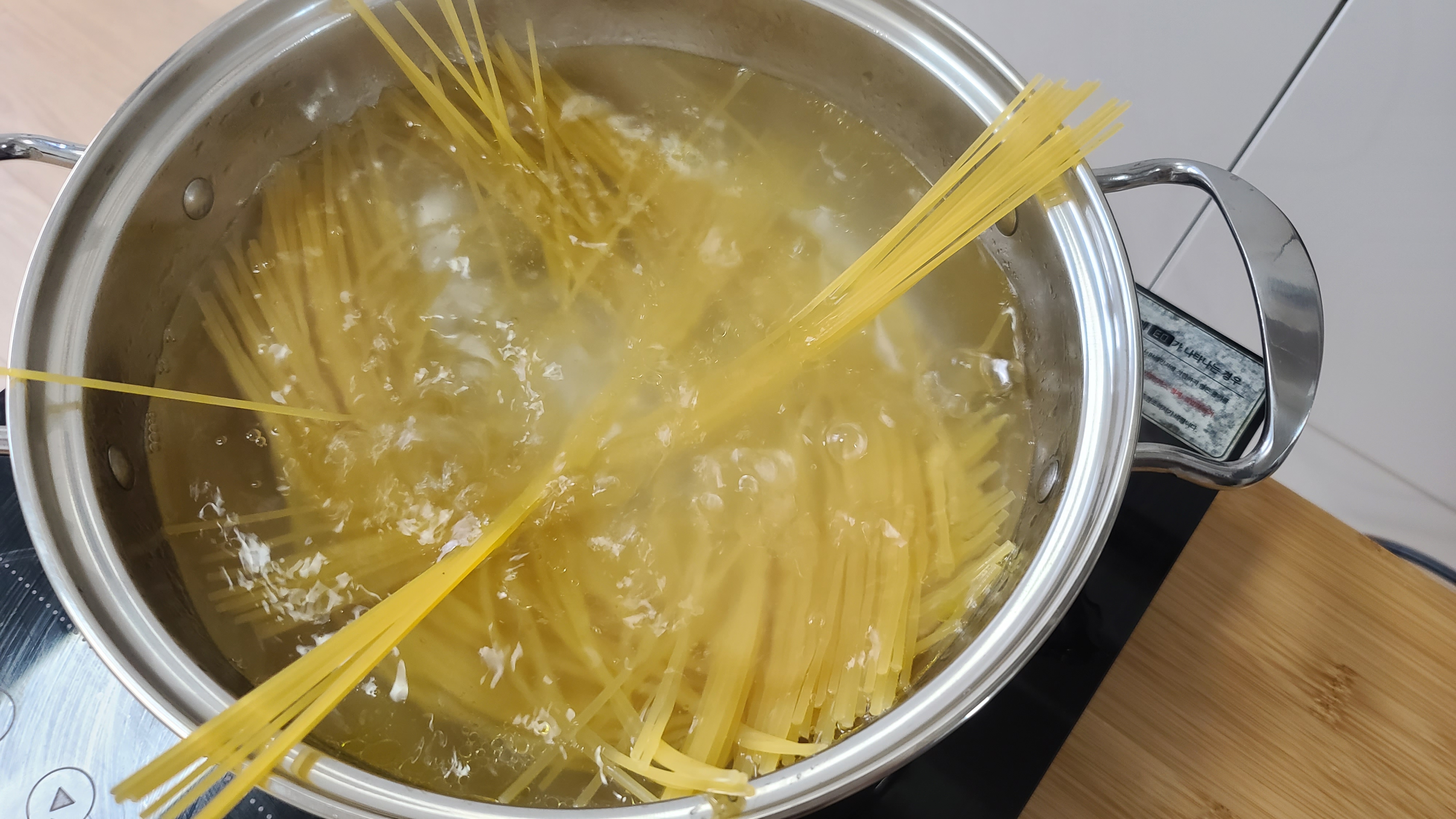 그런 다음 끓는 물에 스파게티면을 넣고~