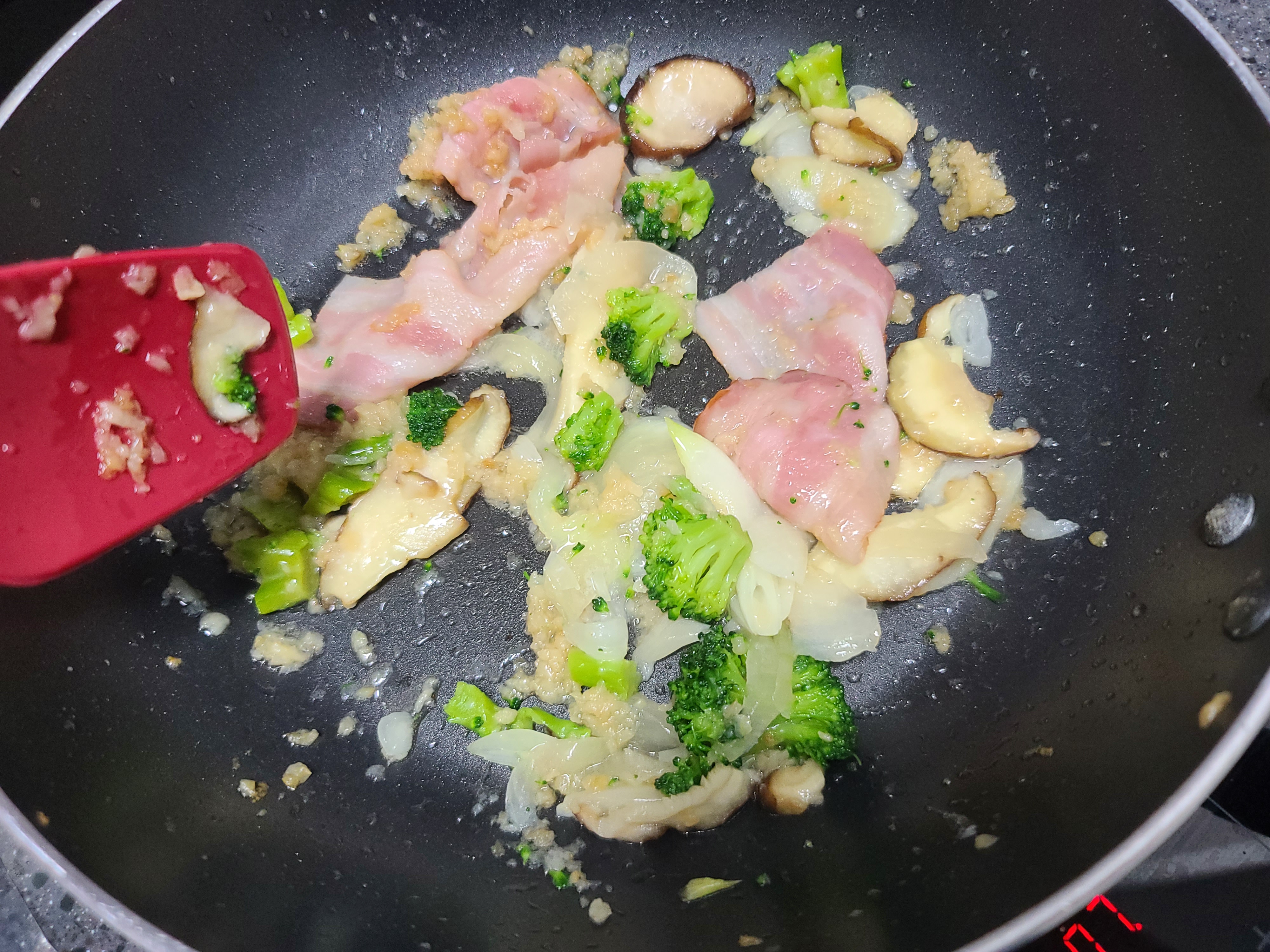 3. 마늘이 노릇해지면, 함께 있던 베이컨과 야채도 볶아줍니다.