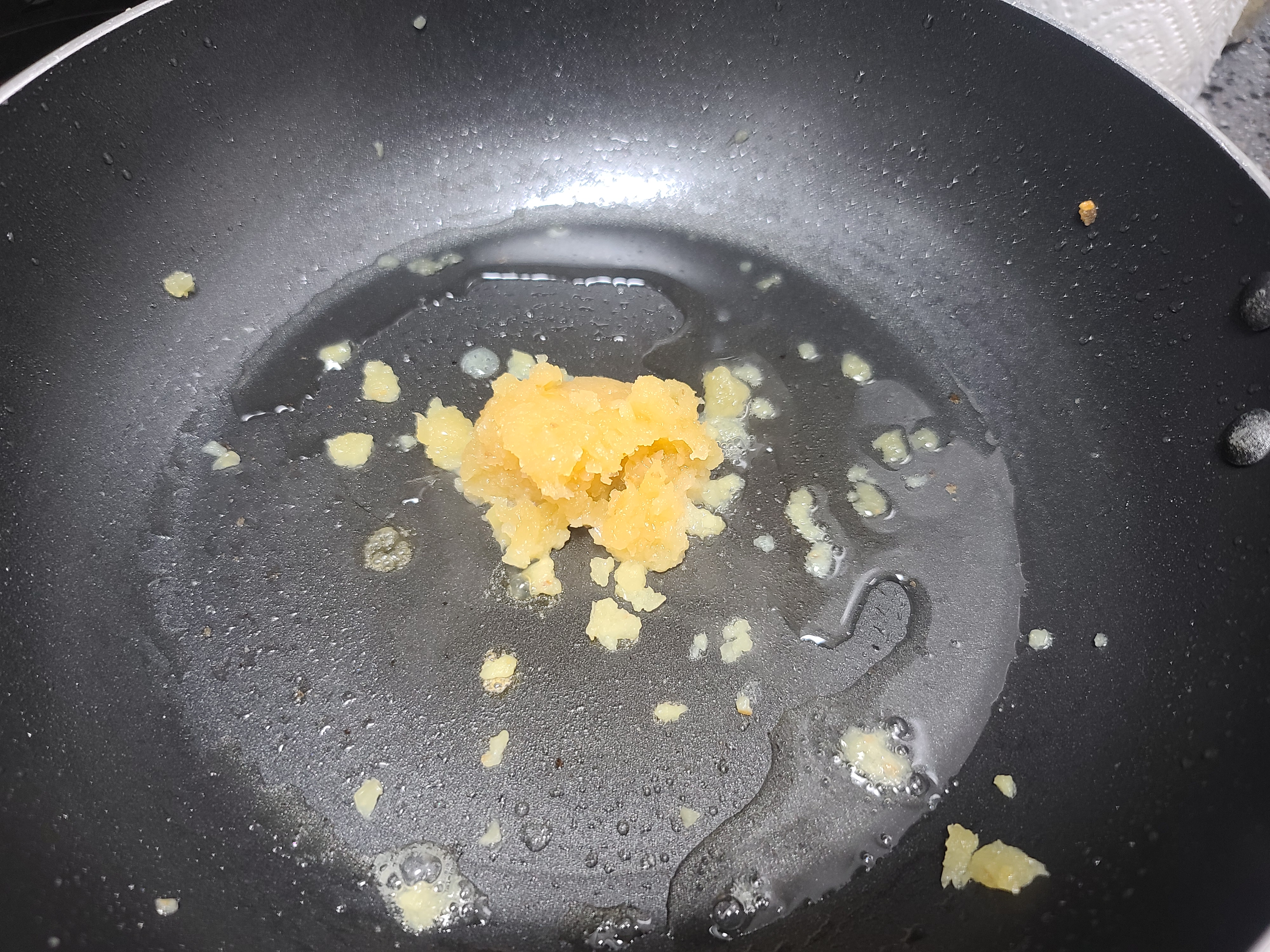 2. 팬에 오일을 두르고~! 다진 마늘을 노릇하게 볶아줍니다.