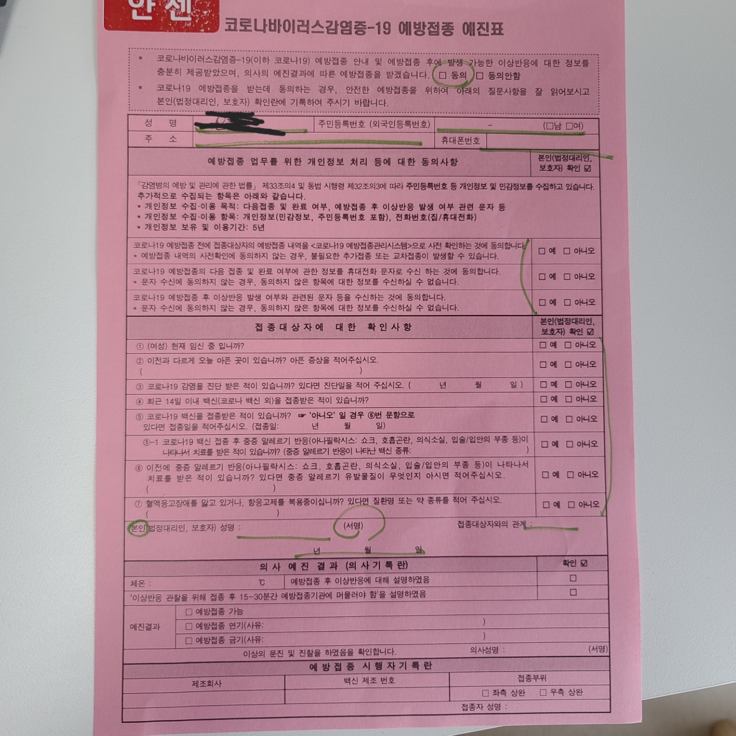 코로나바이러스감엽증 예방접종 예진표는 간단하더라고요,