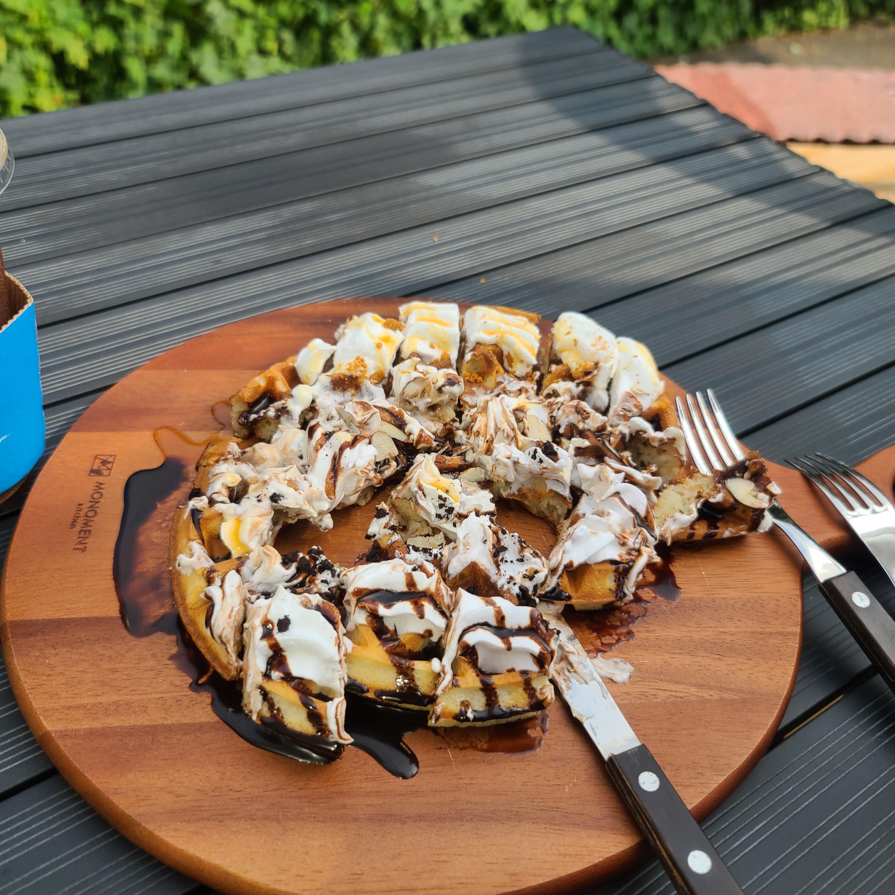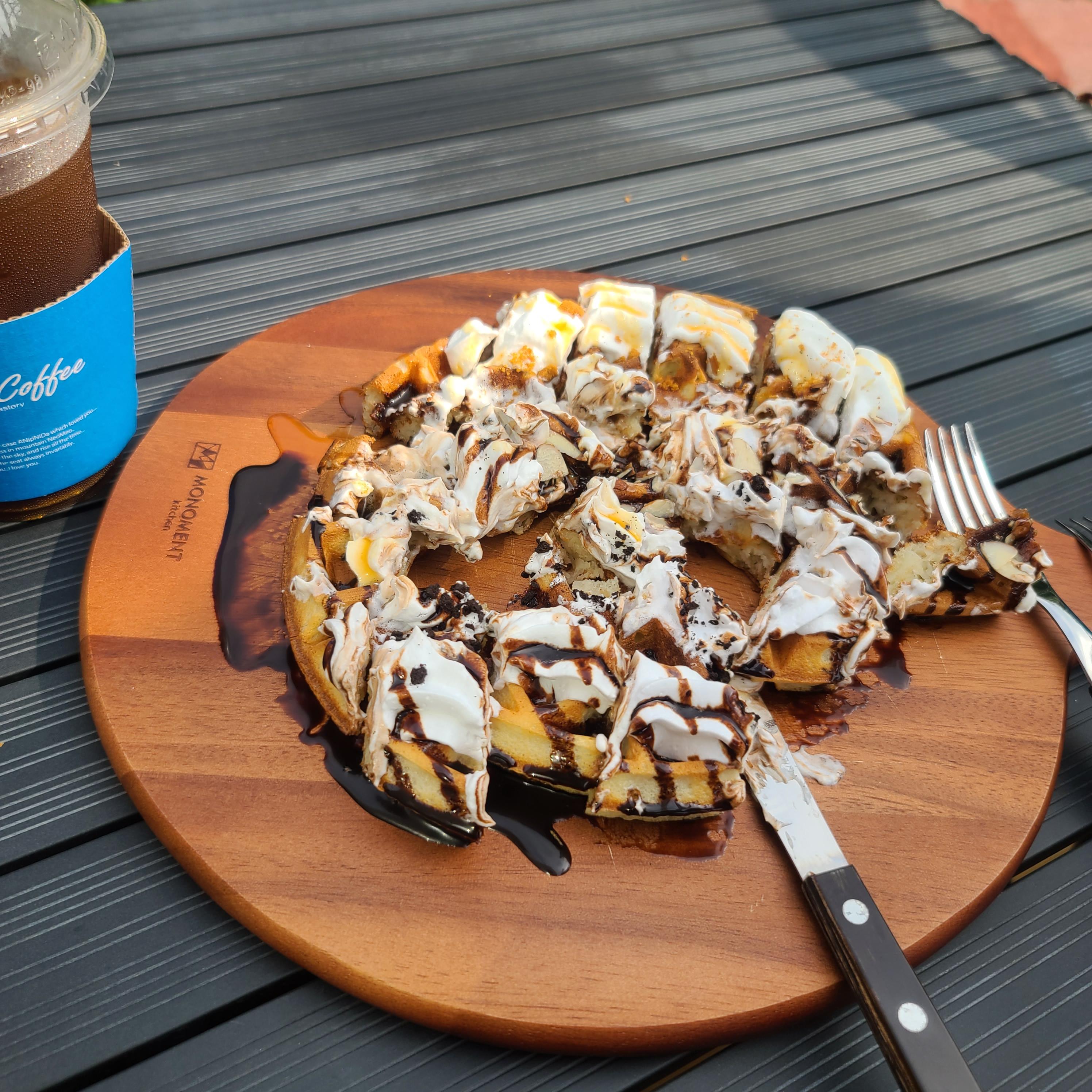 밖에서 피자를 먹듯~ 와플을 아주 맛있게~! ㅎ