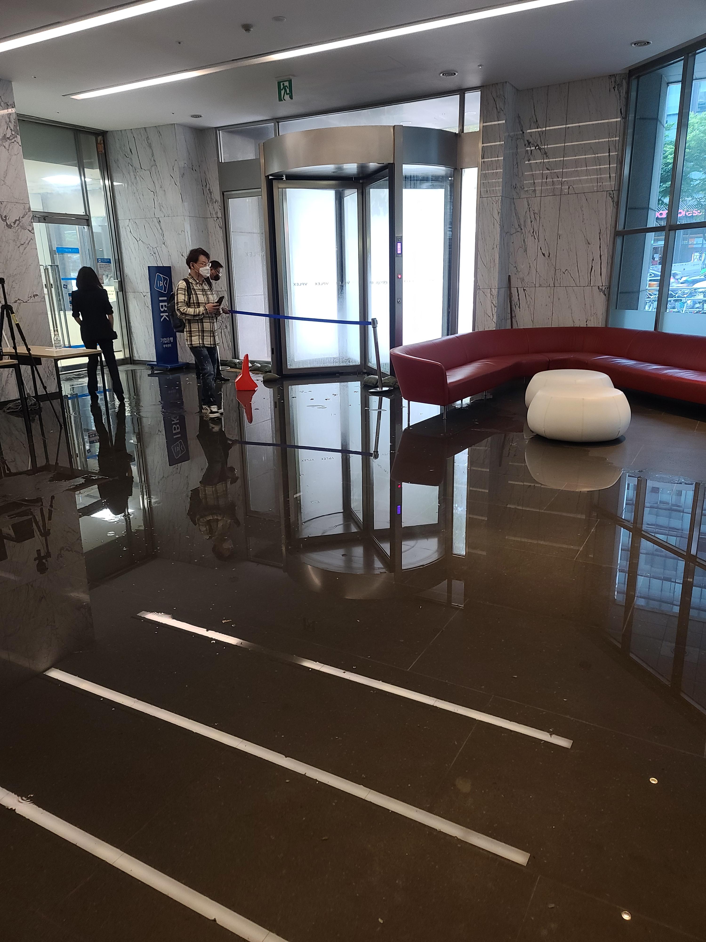 저렇게 물기둥을 내며, 1층 로비로 물이 들어와서,,