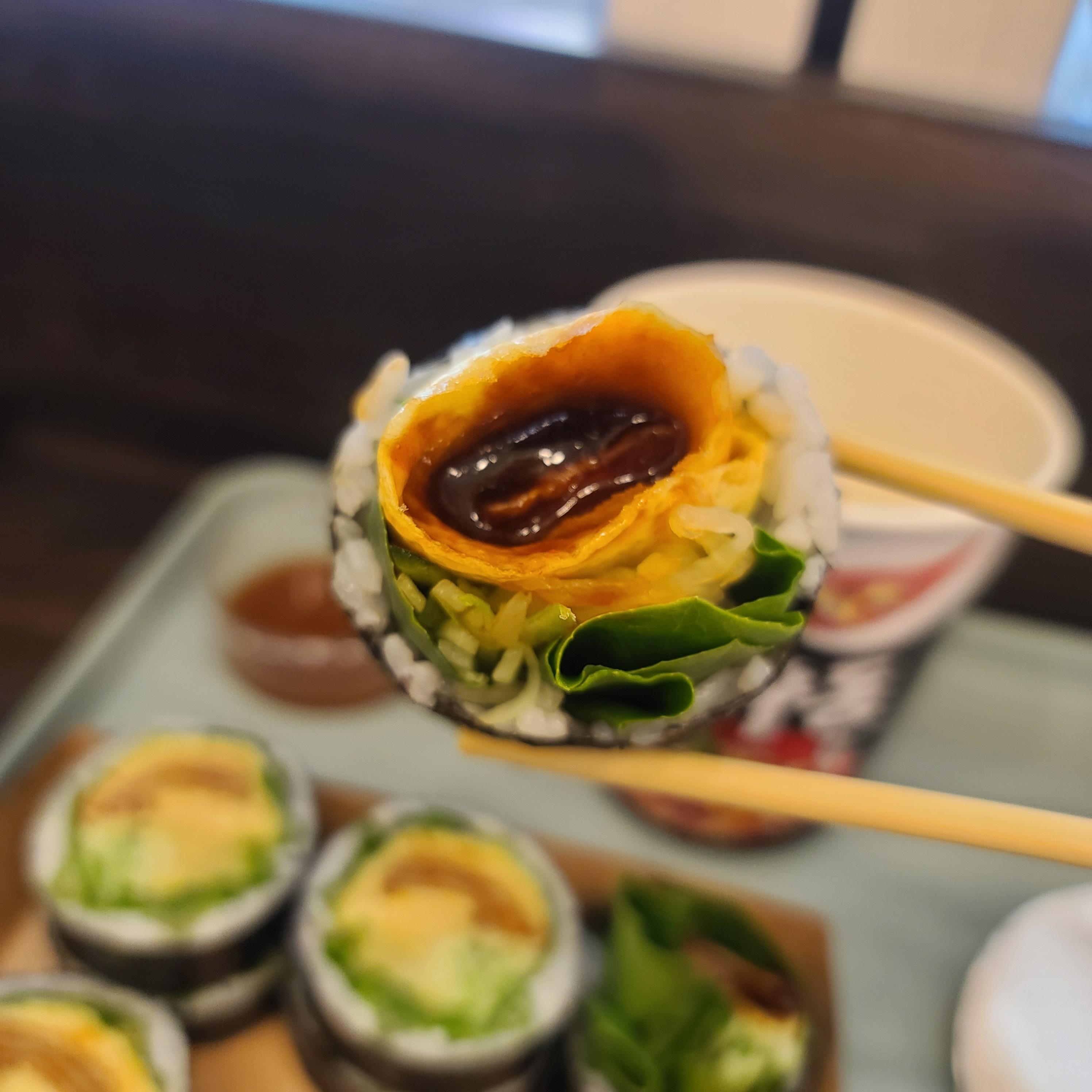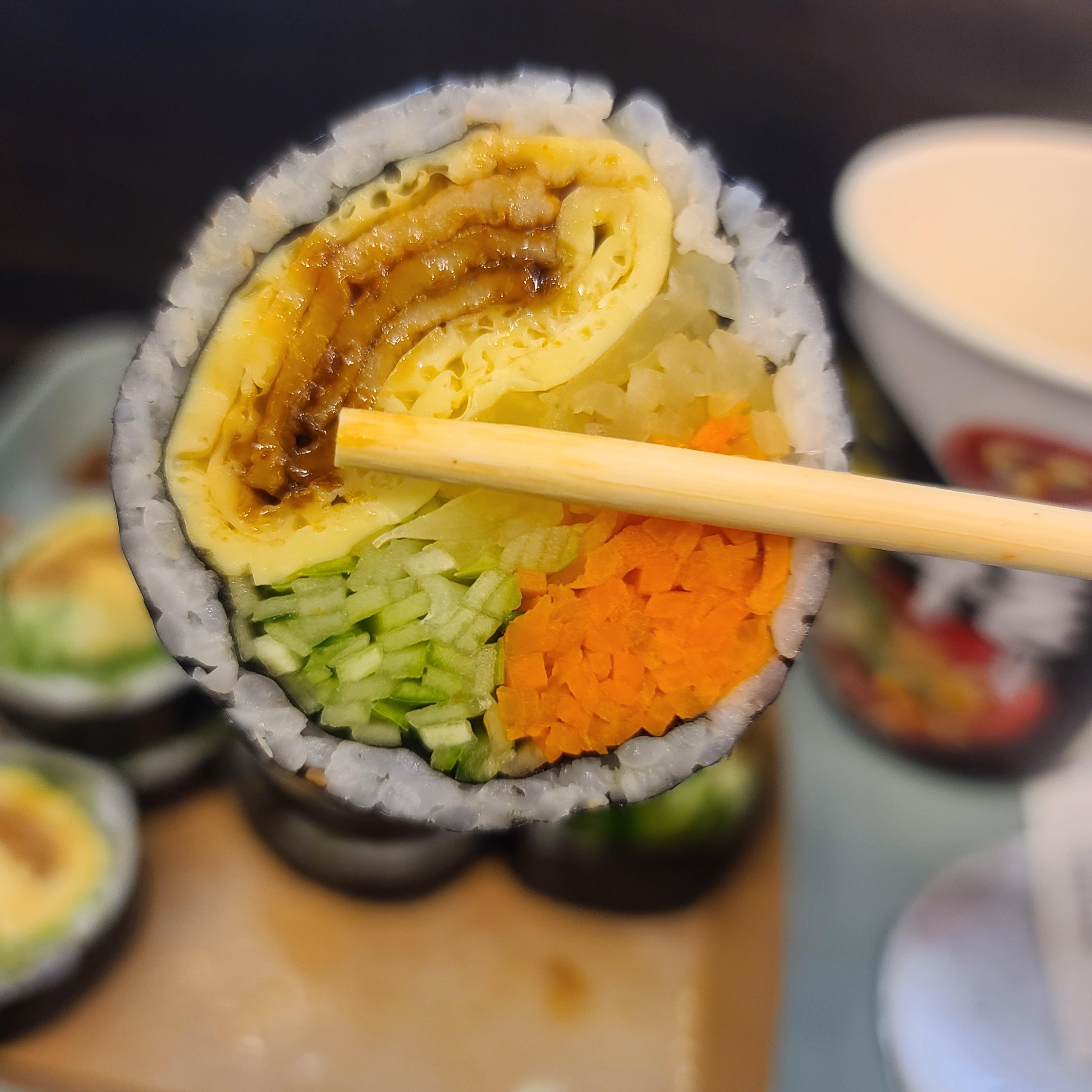 밥의 양보다 야채 가득! 건강한 김밥 스타일입니다.