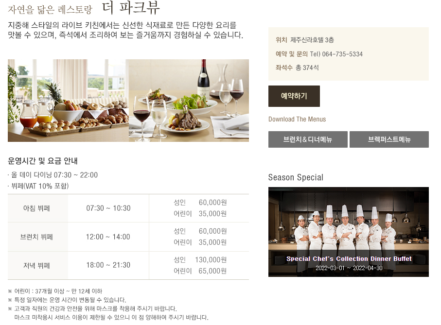 저녁 뷔페는 1인 130,000원이다. 도민은 20% 할인!