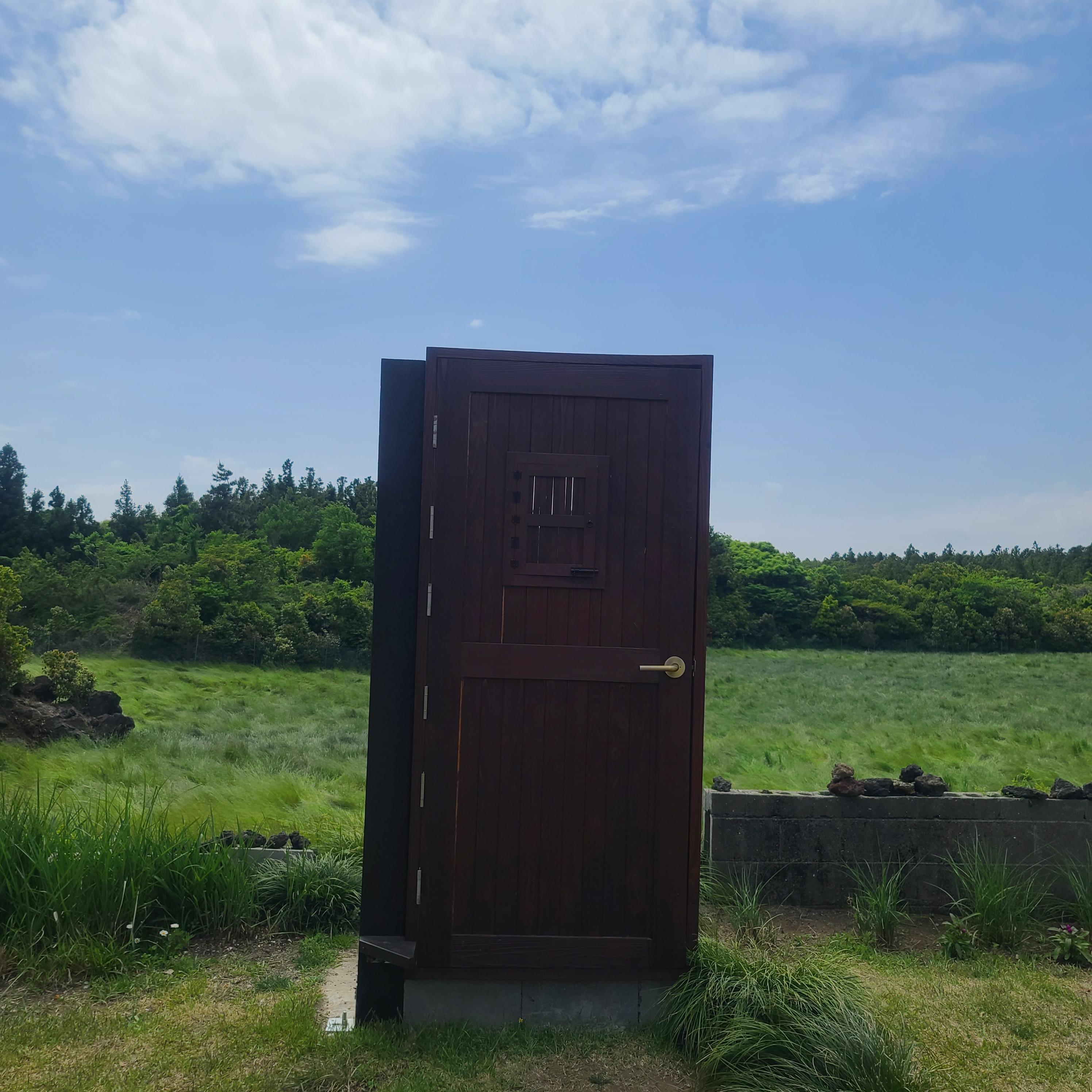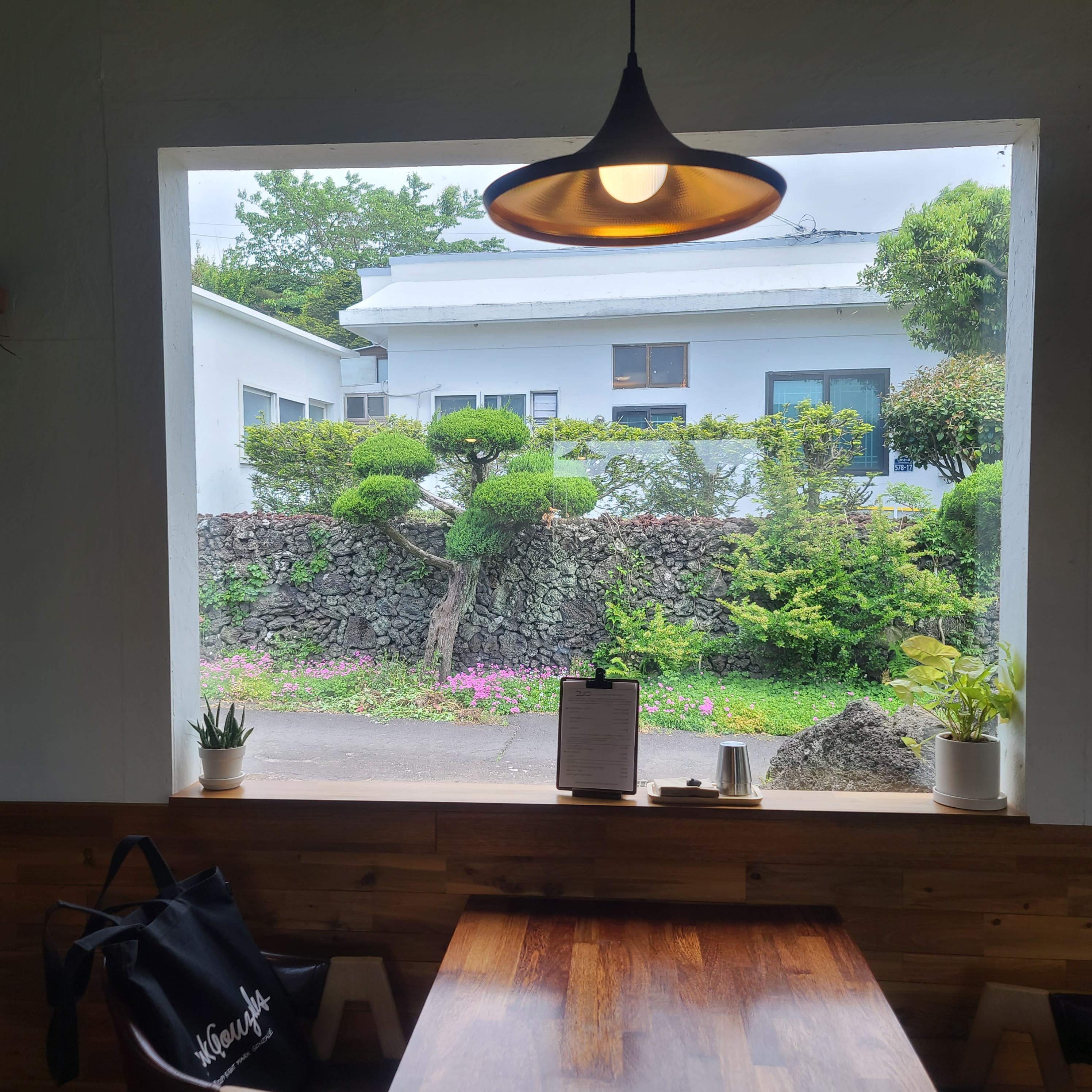 창문 너머로 보이는 제주도의 풍경과 날씨를 잘 볼 수 있습니다.