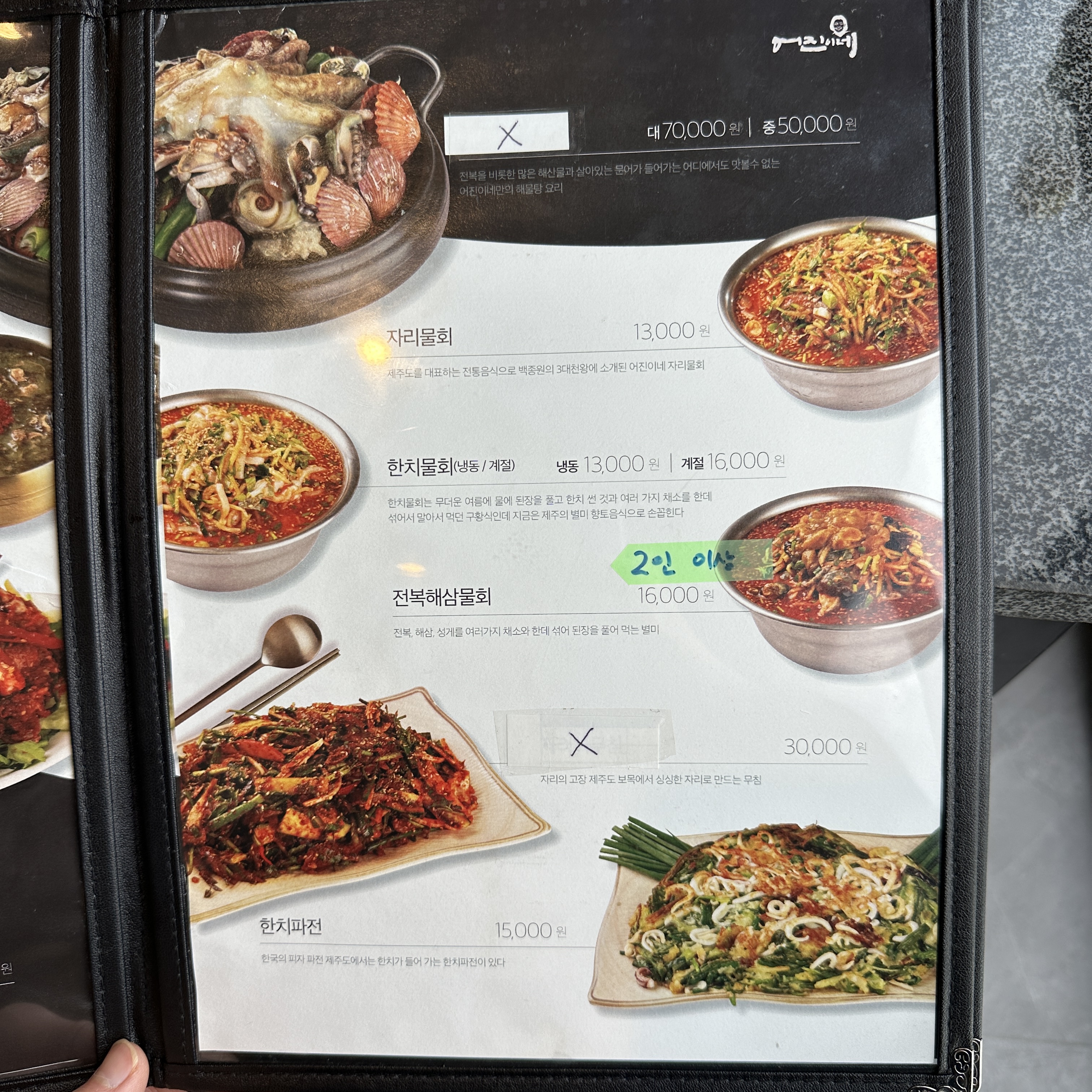 자리물회 2인분과, 전복죽 1인분을 주문했어요,