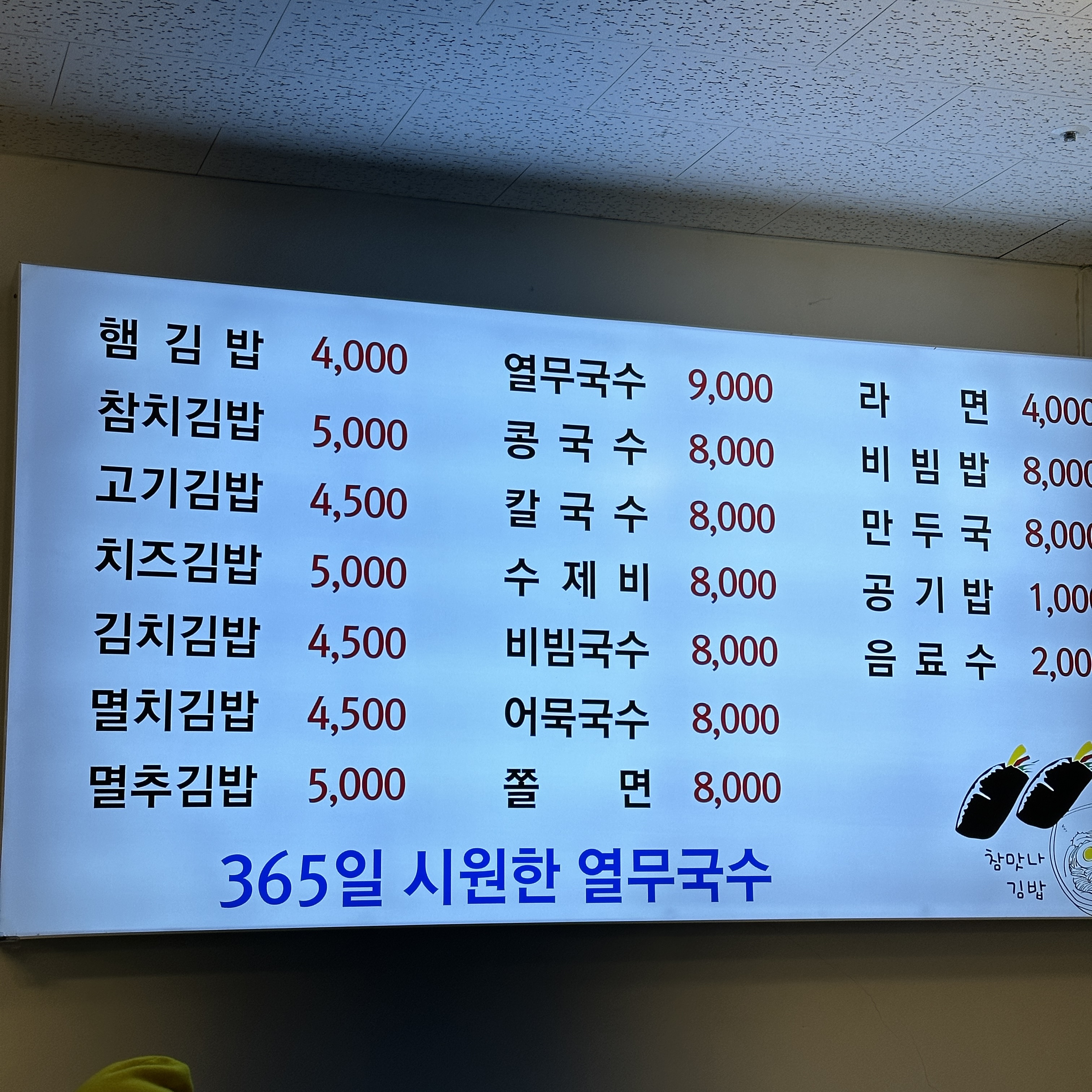 지금 와서 보니, 365일 시원한 열무국수!라고 적혀있네요.