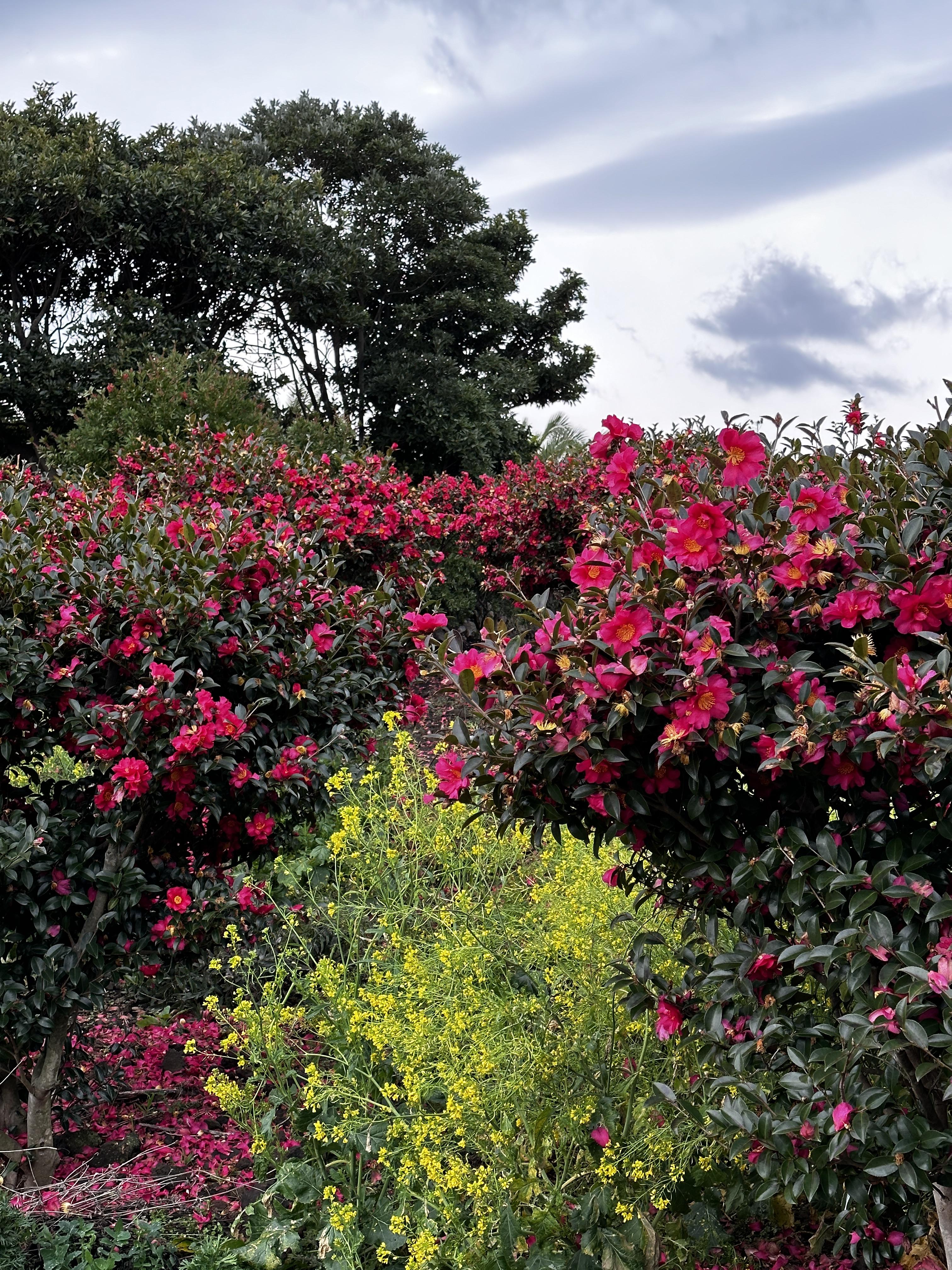 무료 정원에는 동백꽃과 유채꽃이 함께 있는 이색풍경~!