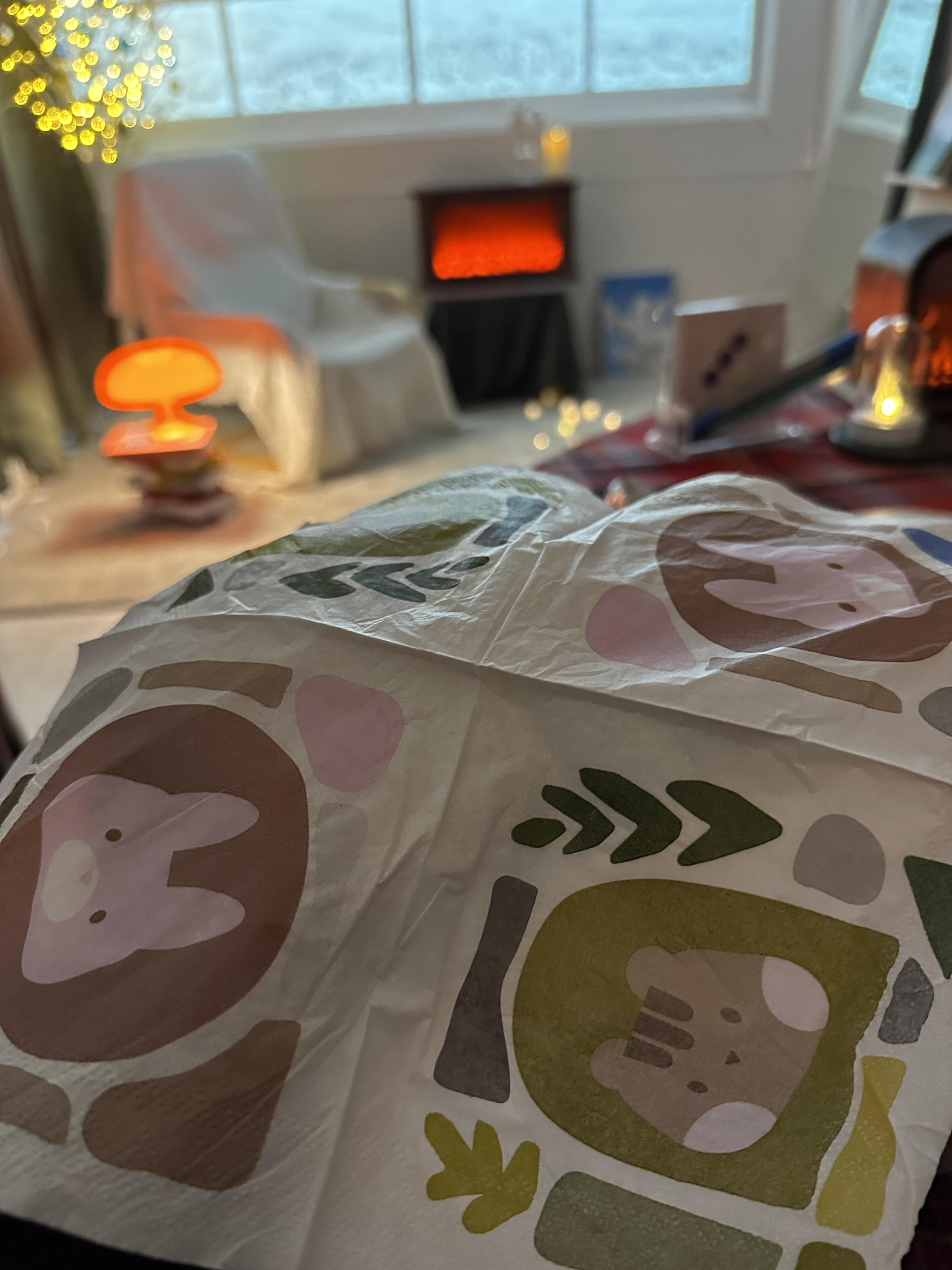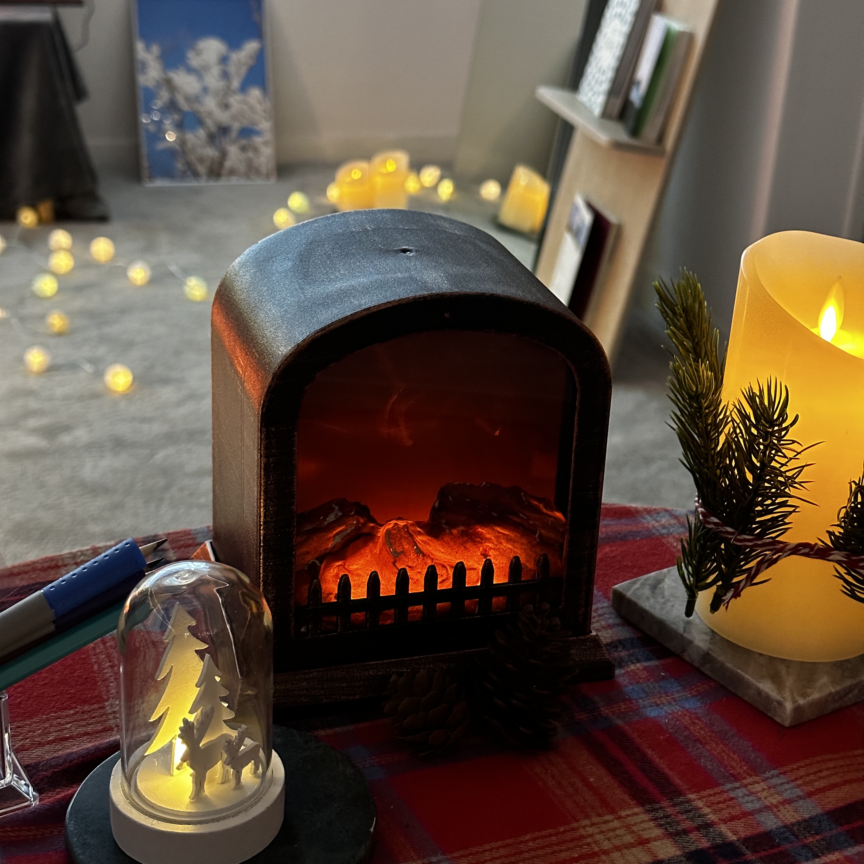 테이블이 있고, 의자와 인테리어 벽난로가 있었어요.