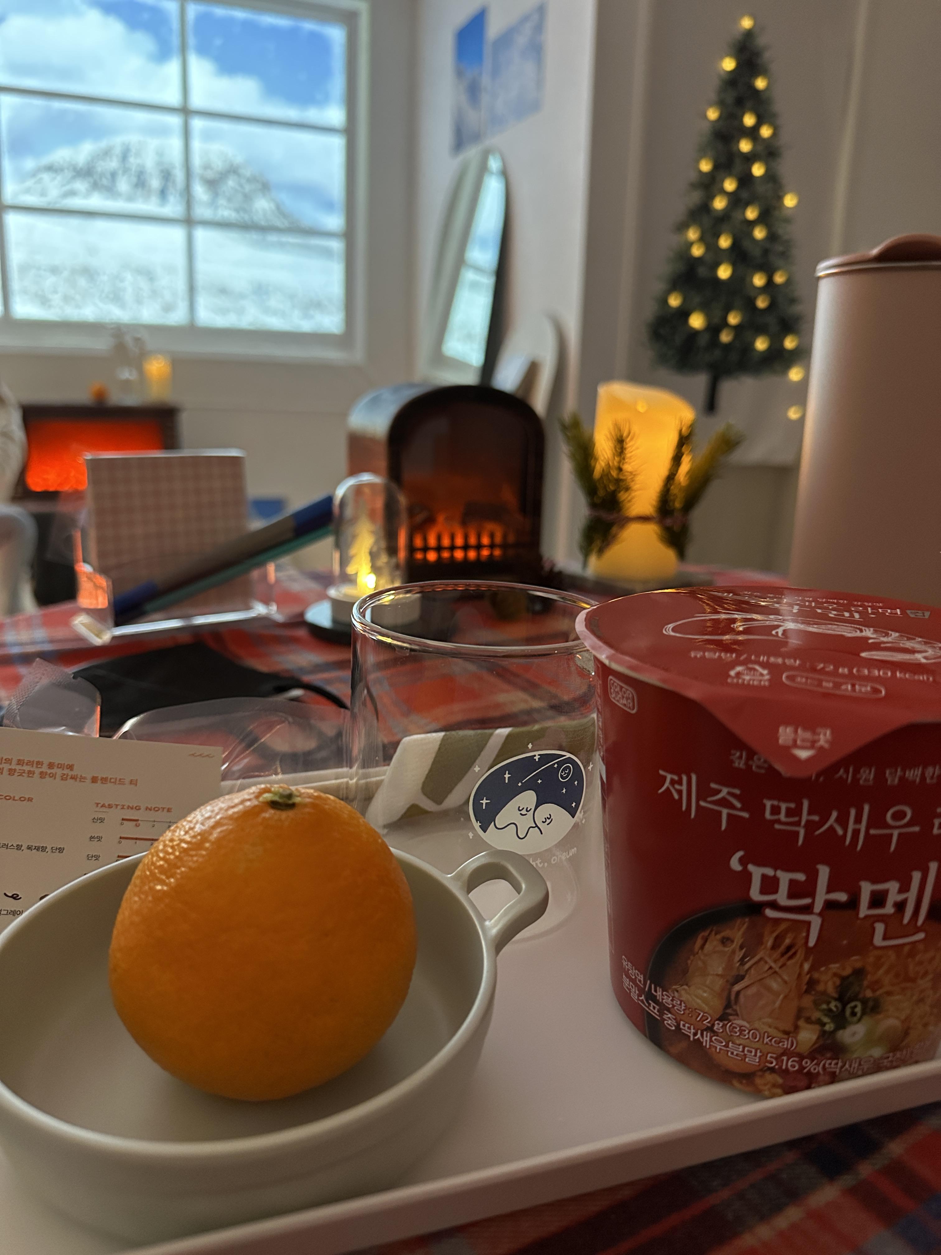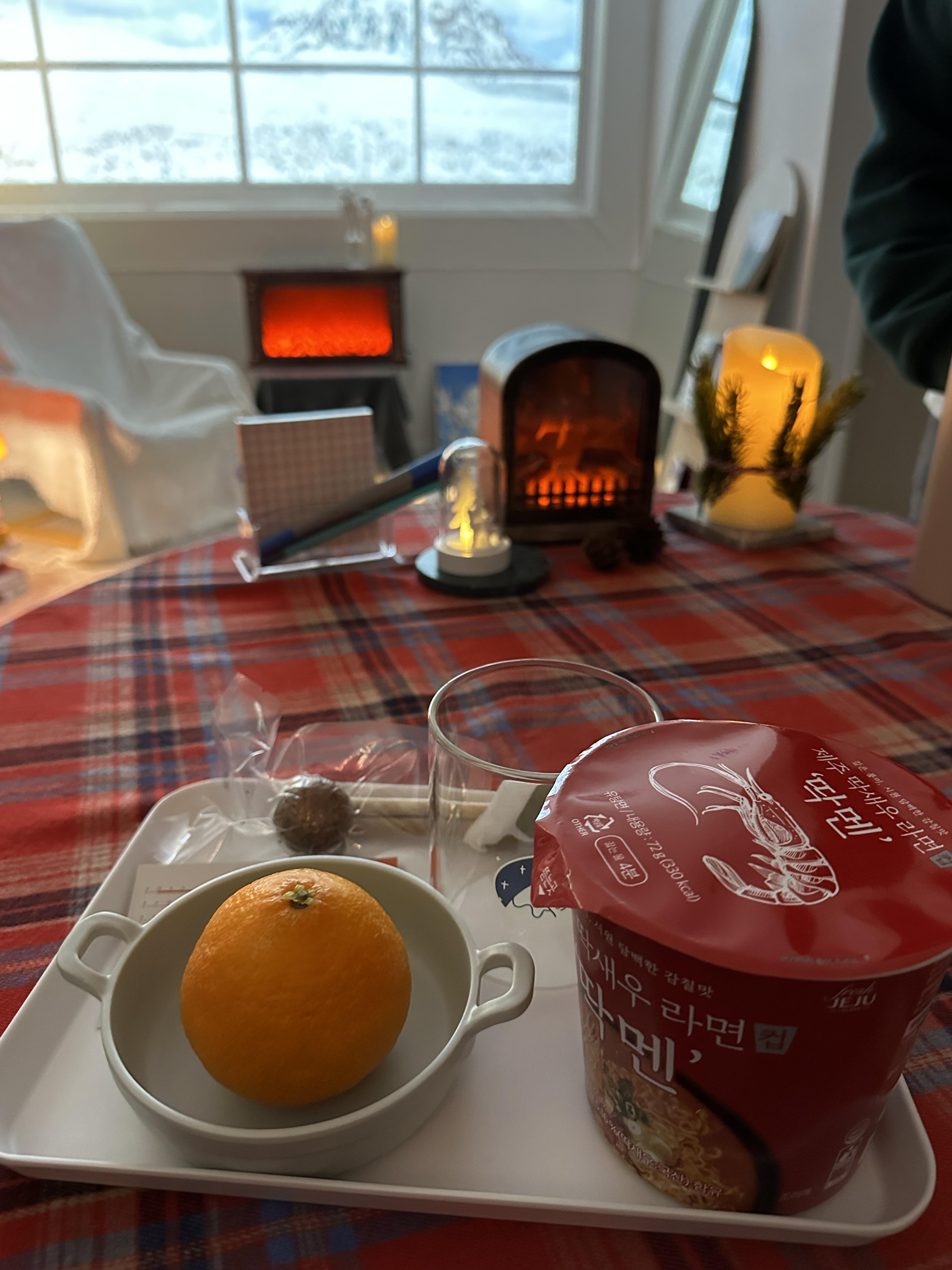 구성으로는 차와, 라면, 그리고 귤(레드향? 한라봉?)이 세팅되어 있었습니다,