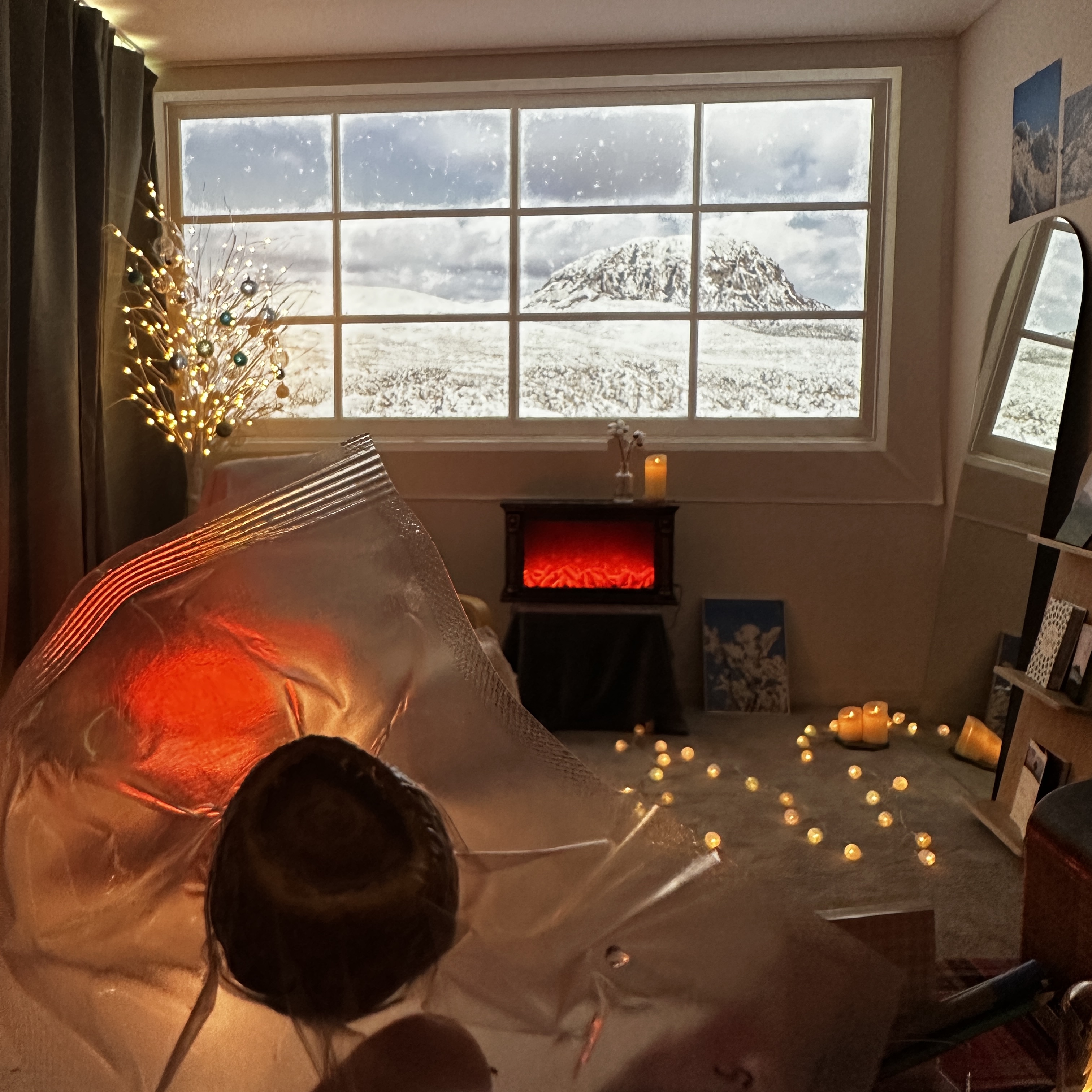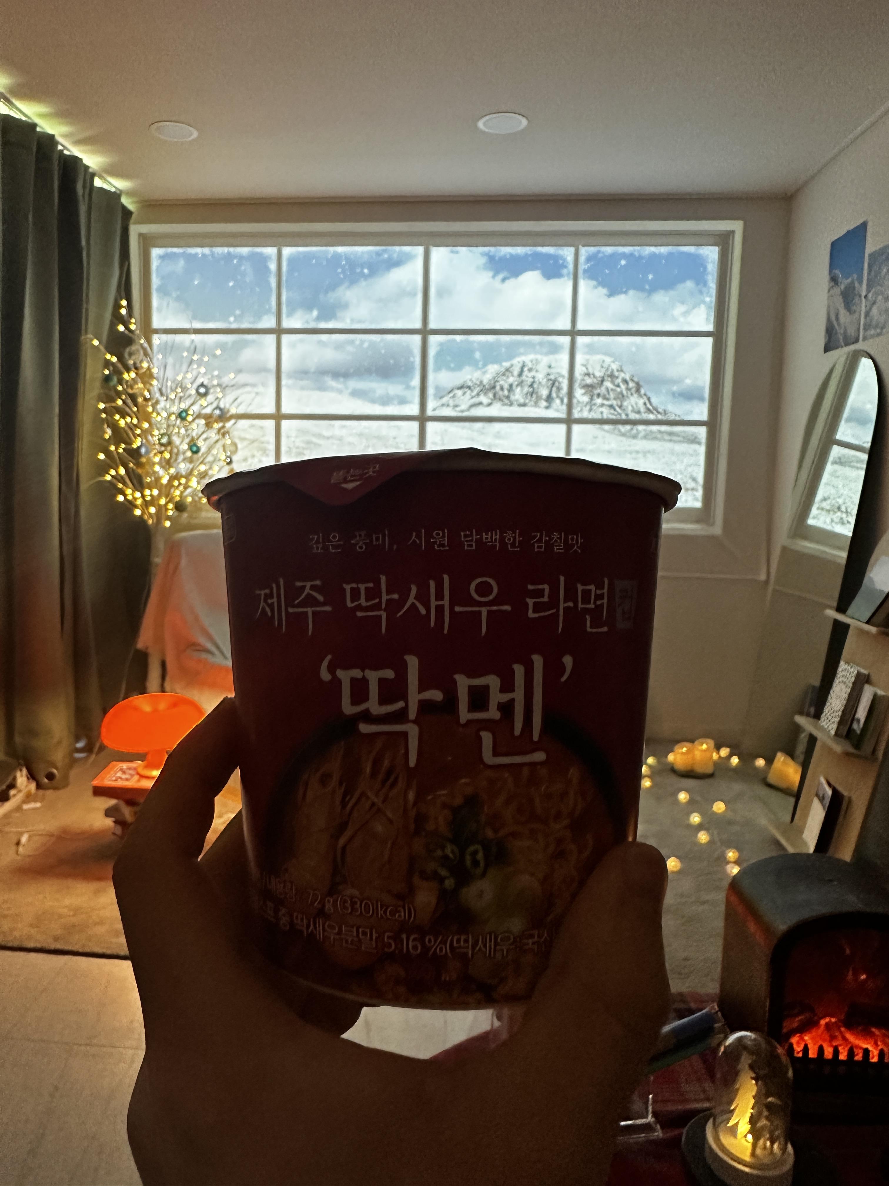 눈 내리는 한라산을 보며, 컵라면을 먹고