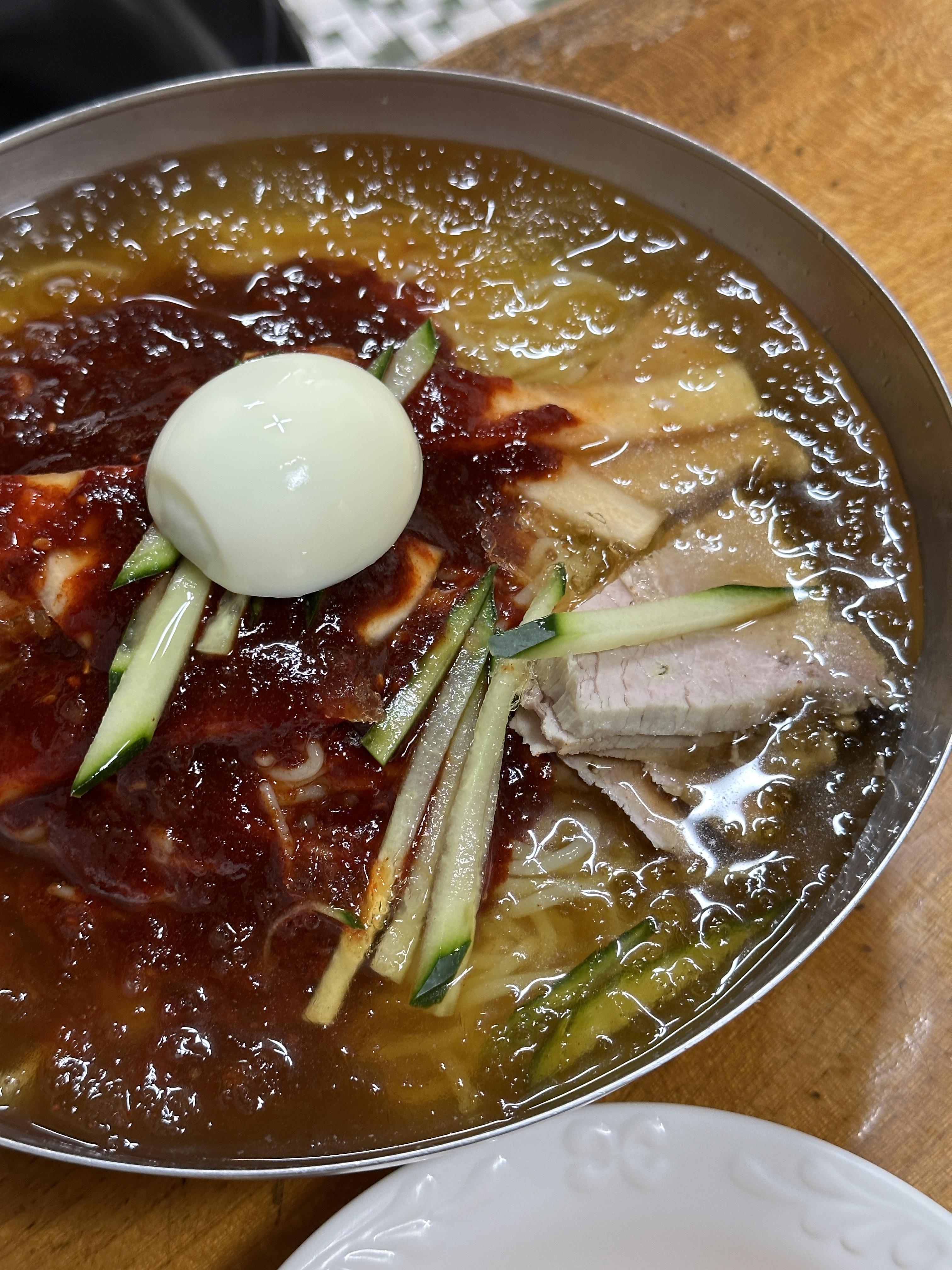 저는 소고기찌개를 먹고 싶어서 소고기 찌개, 그리고 친구는 밀 냉면을 주문했어요.