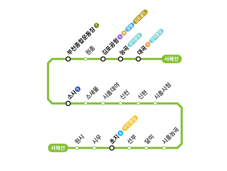 원시역-시우역-초지역-선부역-달미역-시흥능곡역-시흥시청역-신현역-신천역-시흥대야역-소새울역-소사역-부천종합운동장역-원종역-김포공항역-능곡역-대곡역