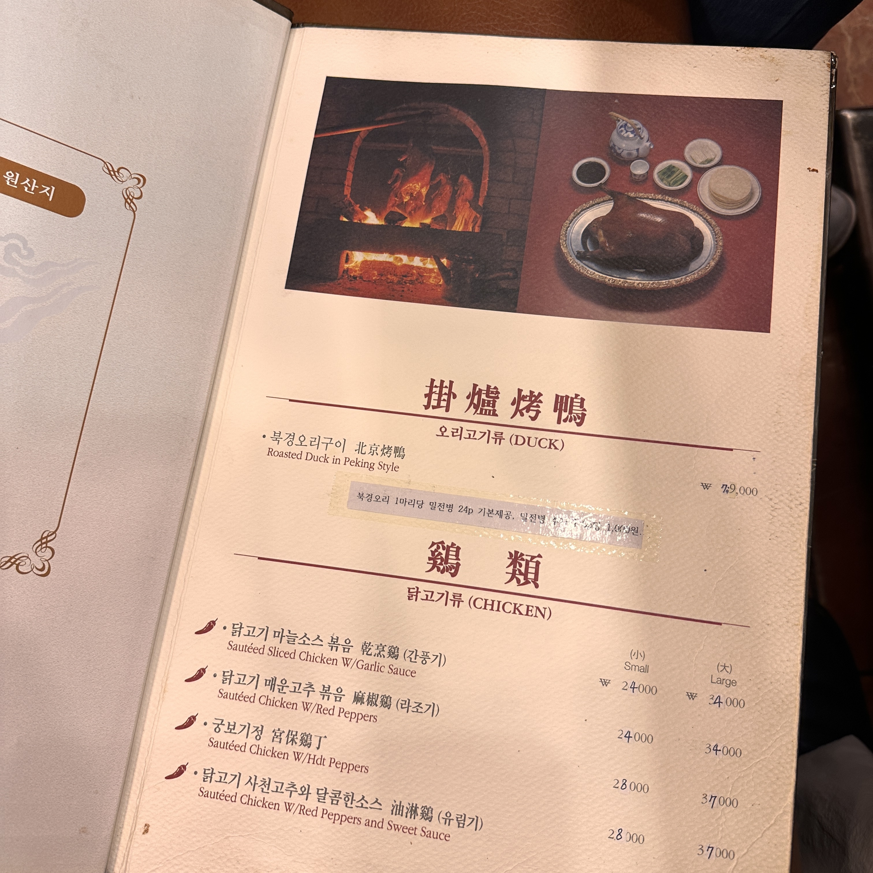 북경오리는 조리시간이 1시간 걸리는 요리임으로 사전에 미리 예약하기!