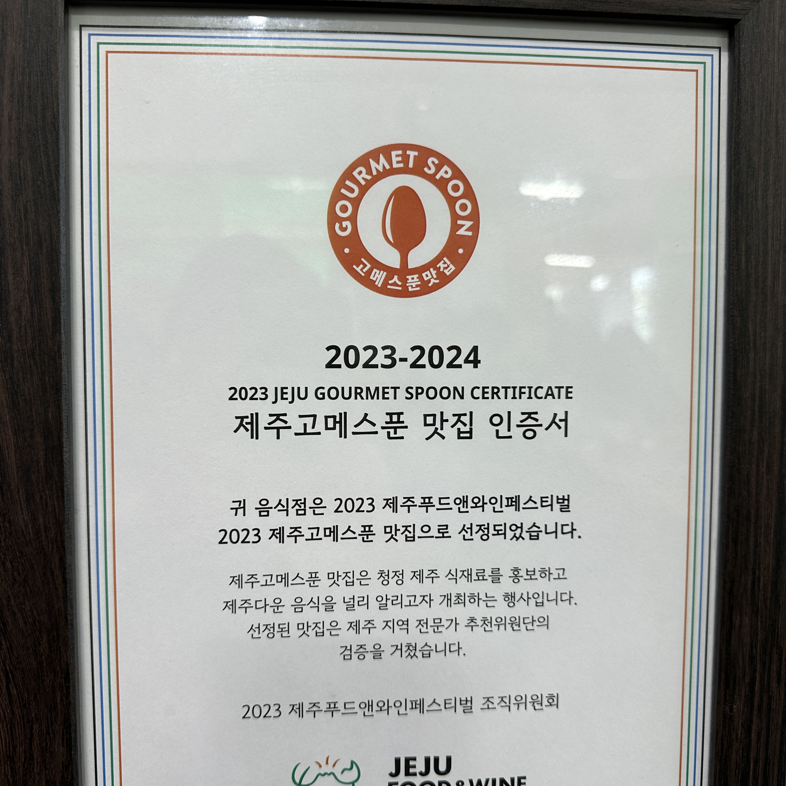 제주 고메스푼 맛집 인증서가 연도별로 부착되어 있었습니다.