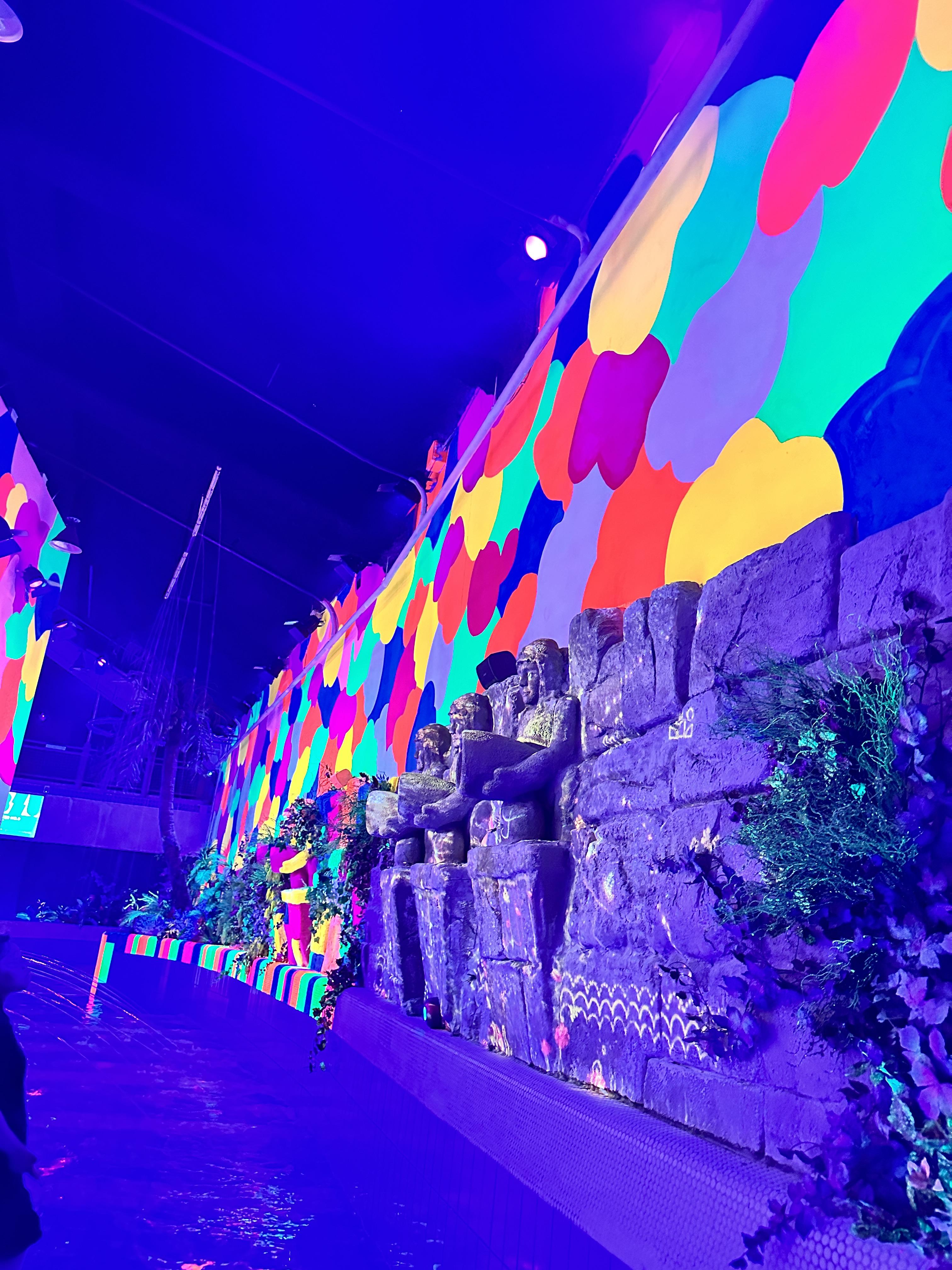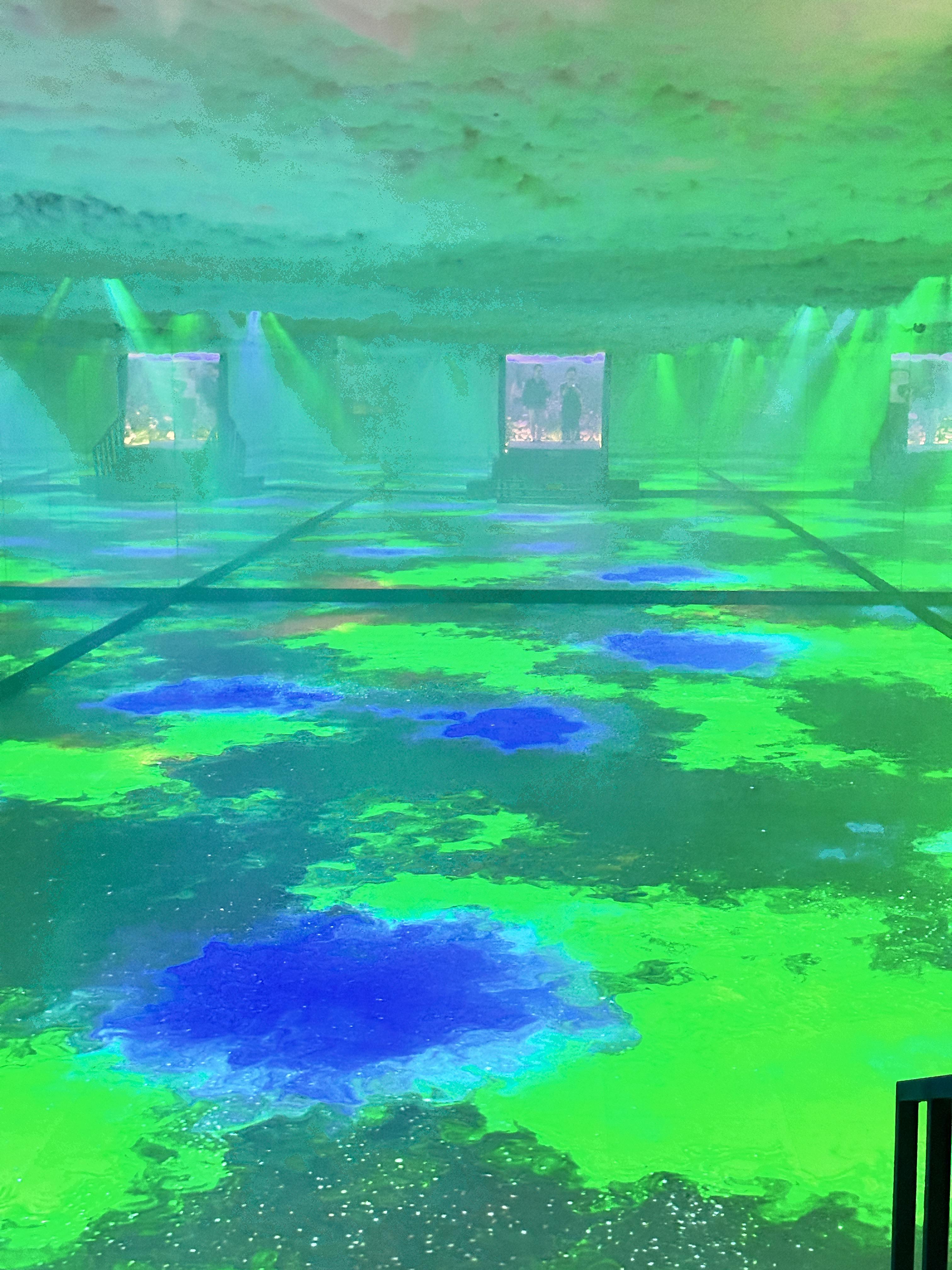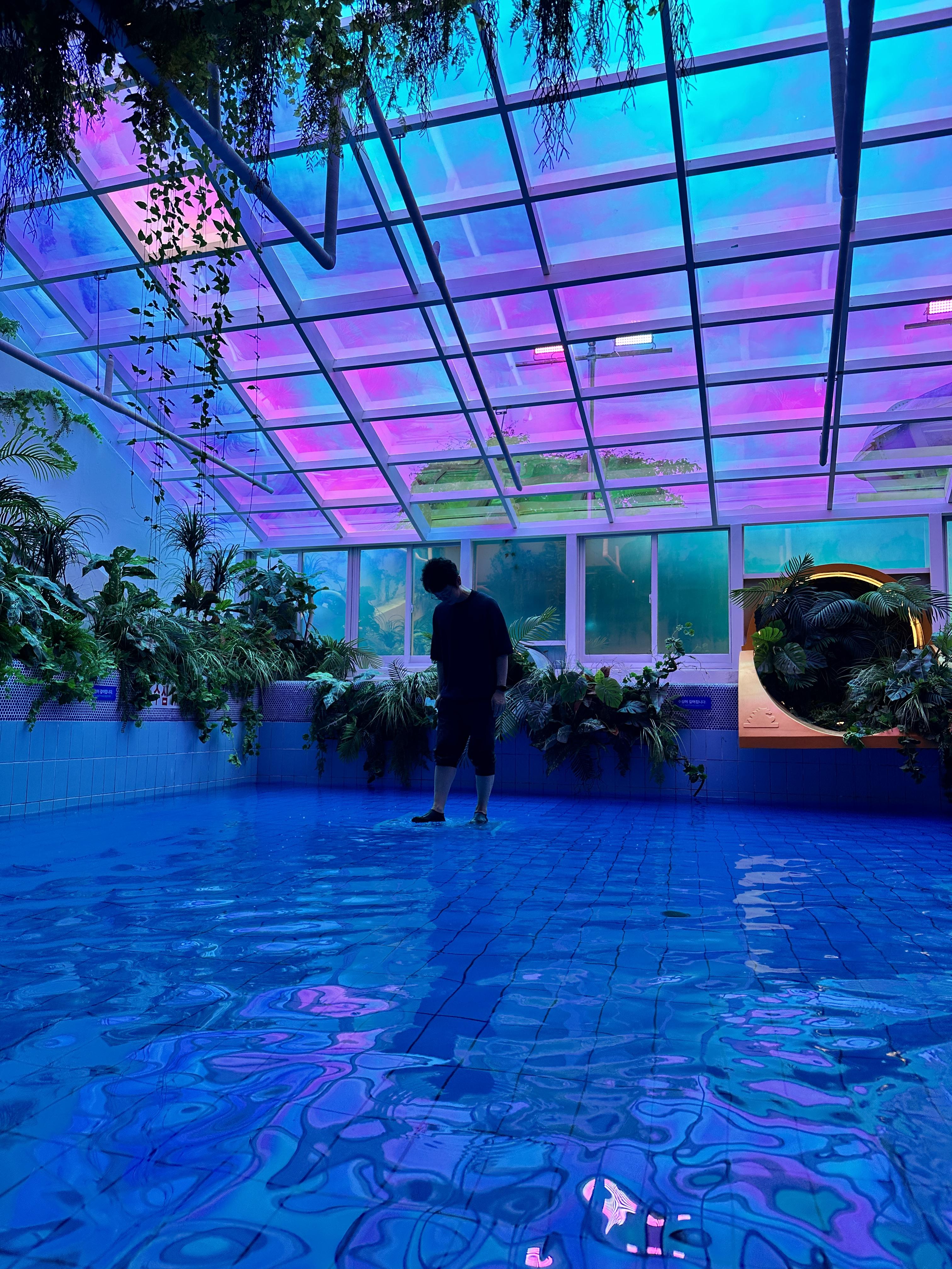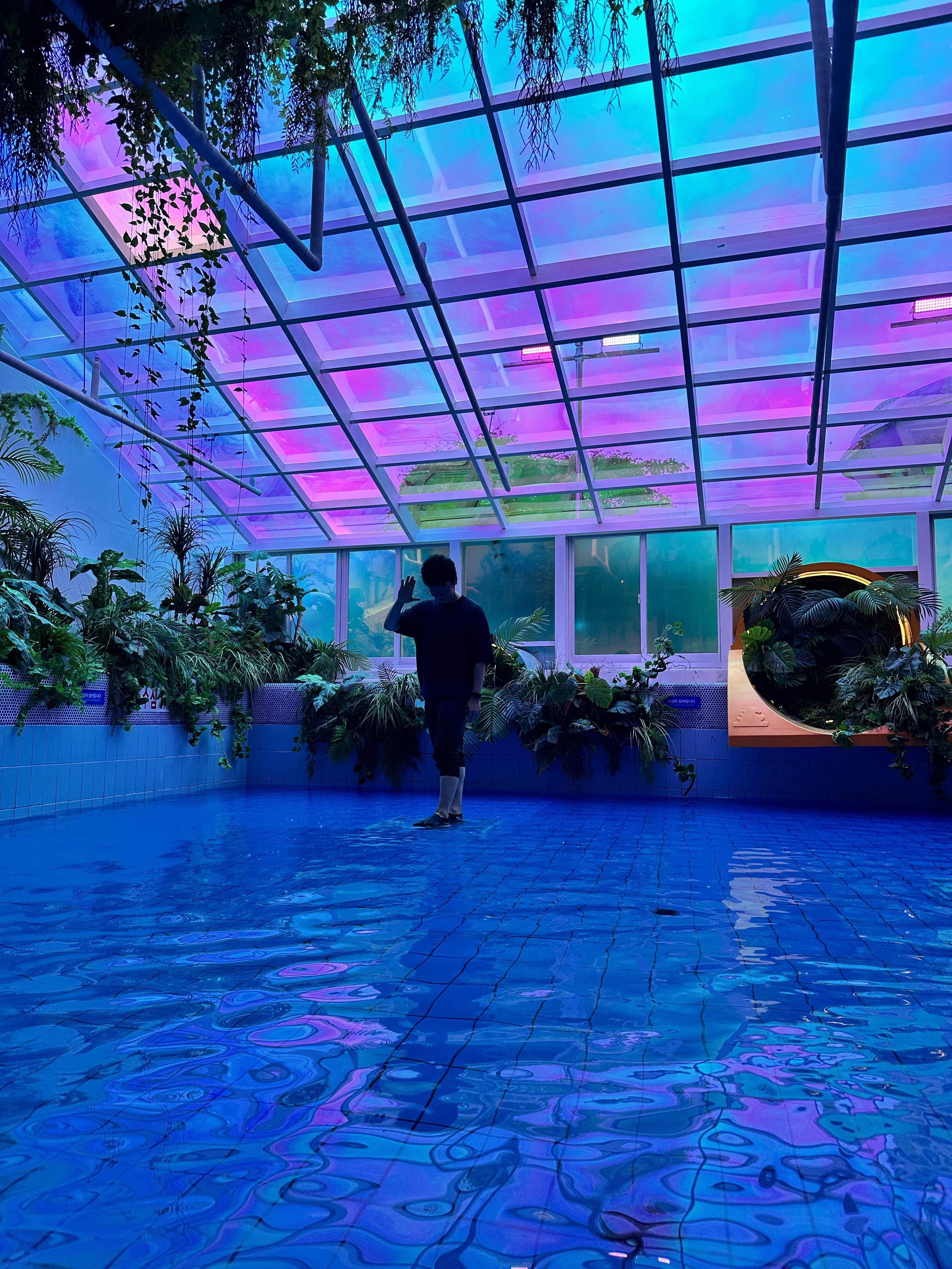 워터파크 이용 공간은 그대로 살리고, 미디어 아트 전시를 공간마다 꾸며 노은 전시관입니다.