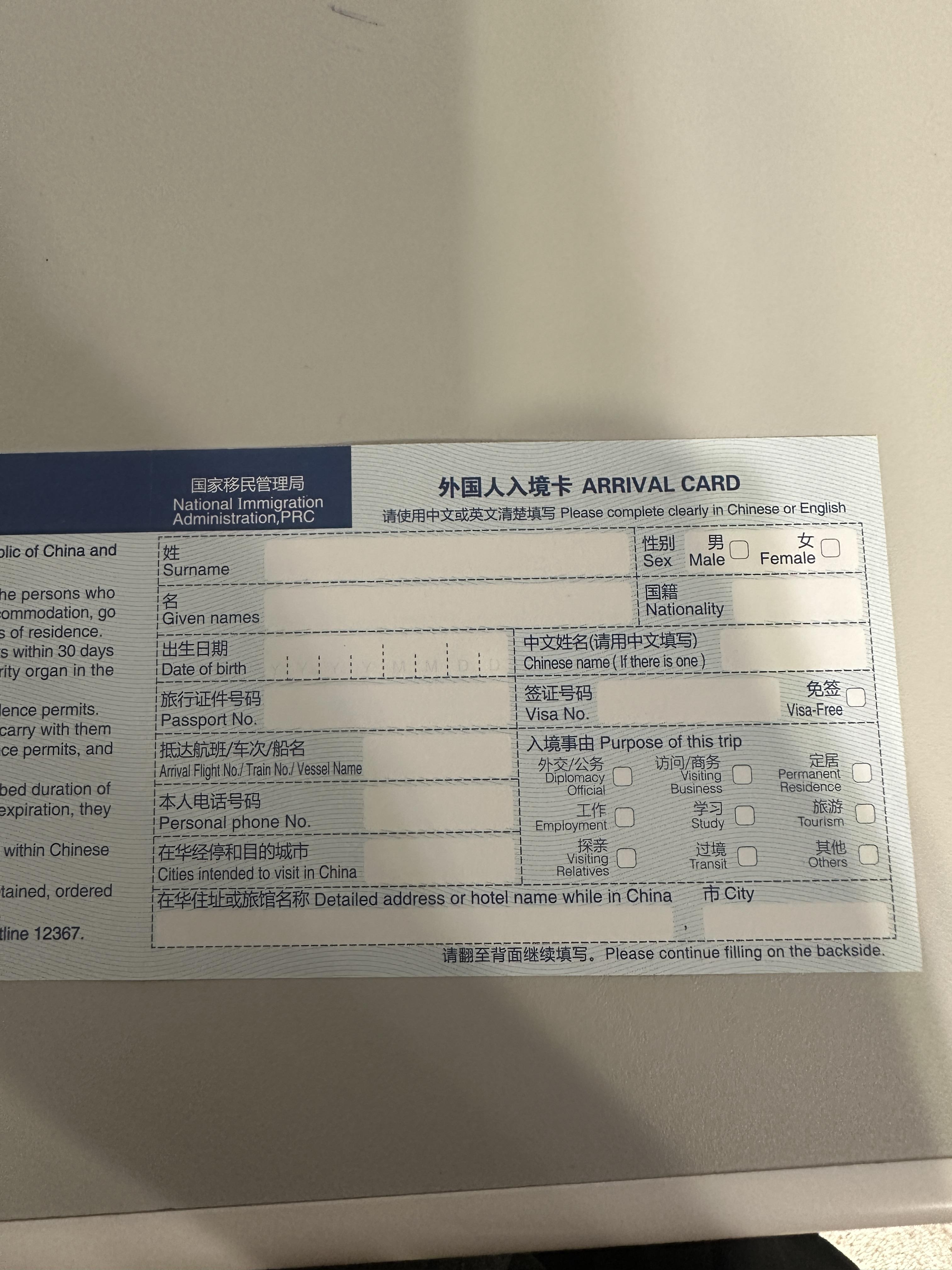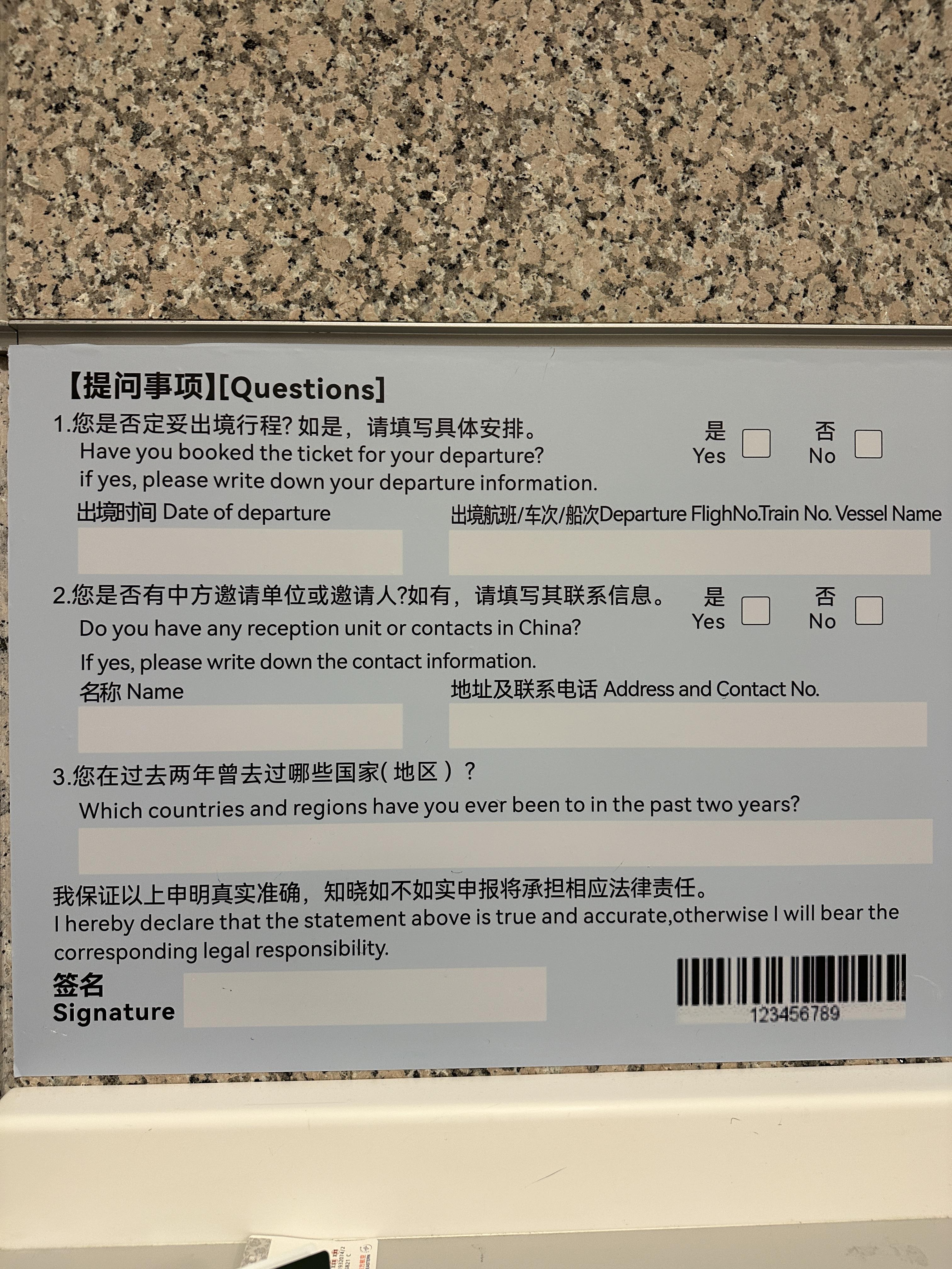 자 그럼... 중국에 입국할 때 쓰는 입국신고서!