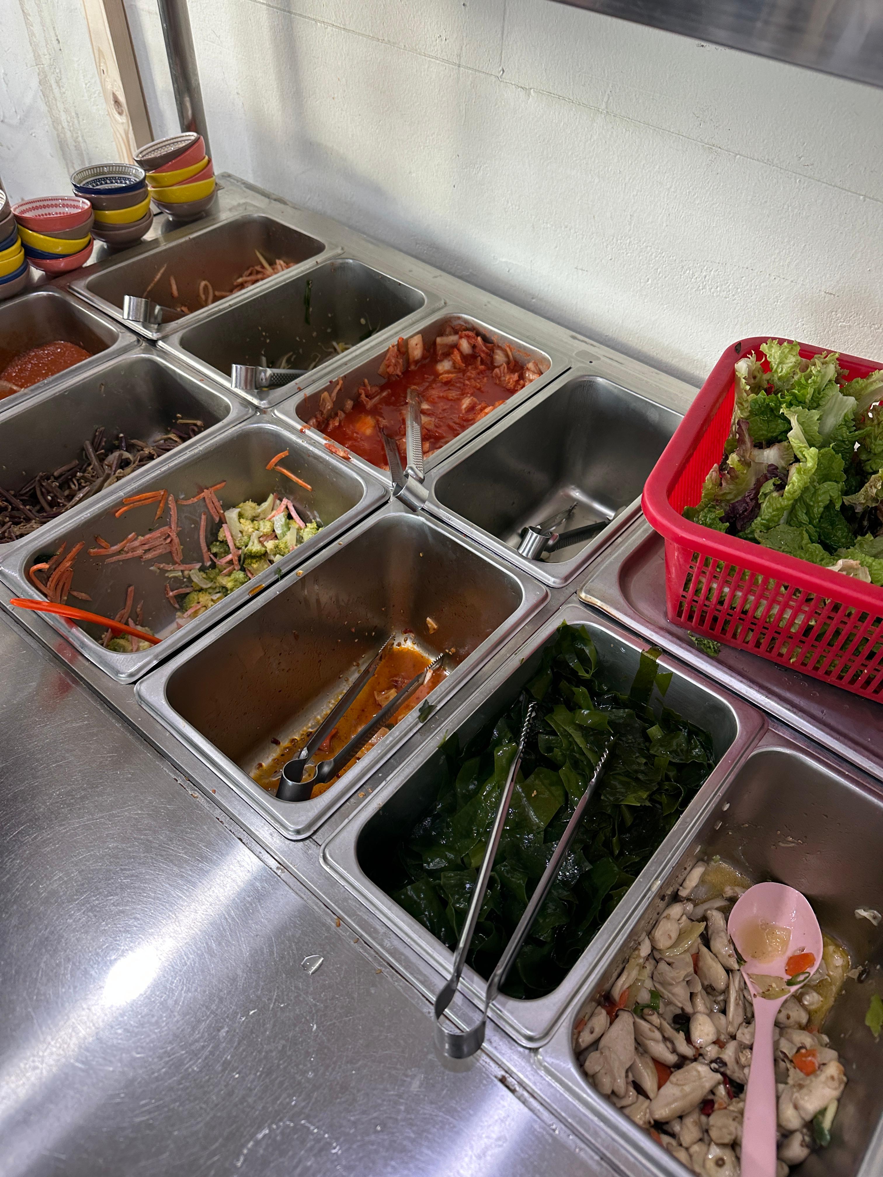 셀프바에, 다양한 반찬을 계속 리필하여 먹을 수 있다.