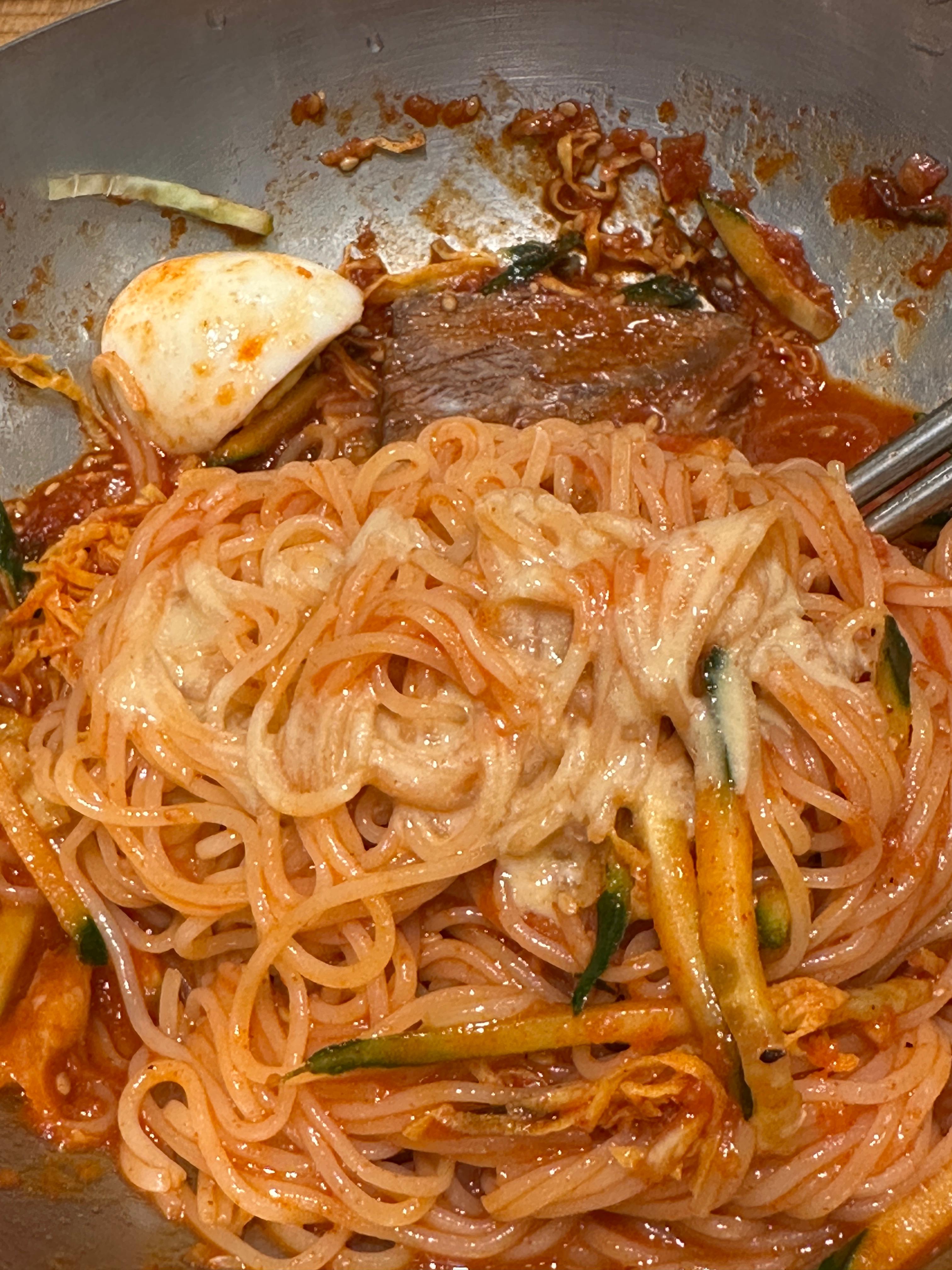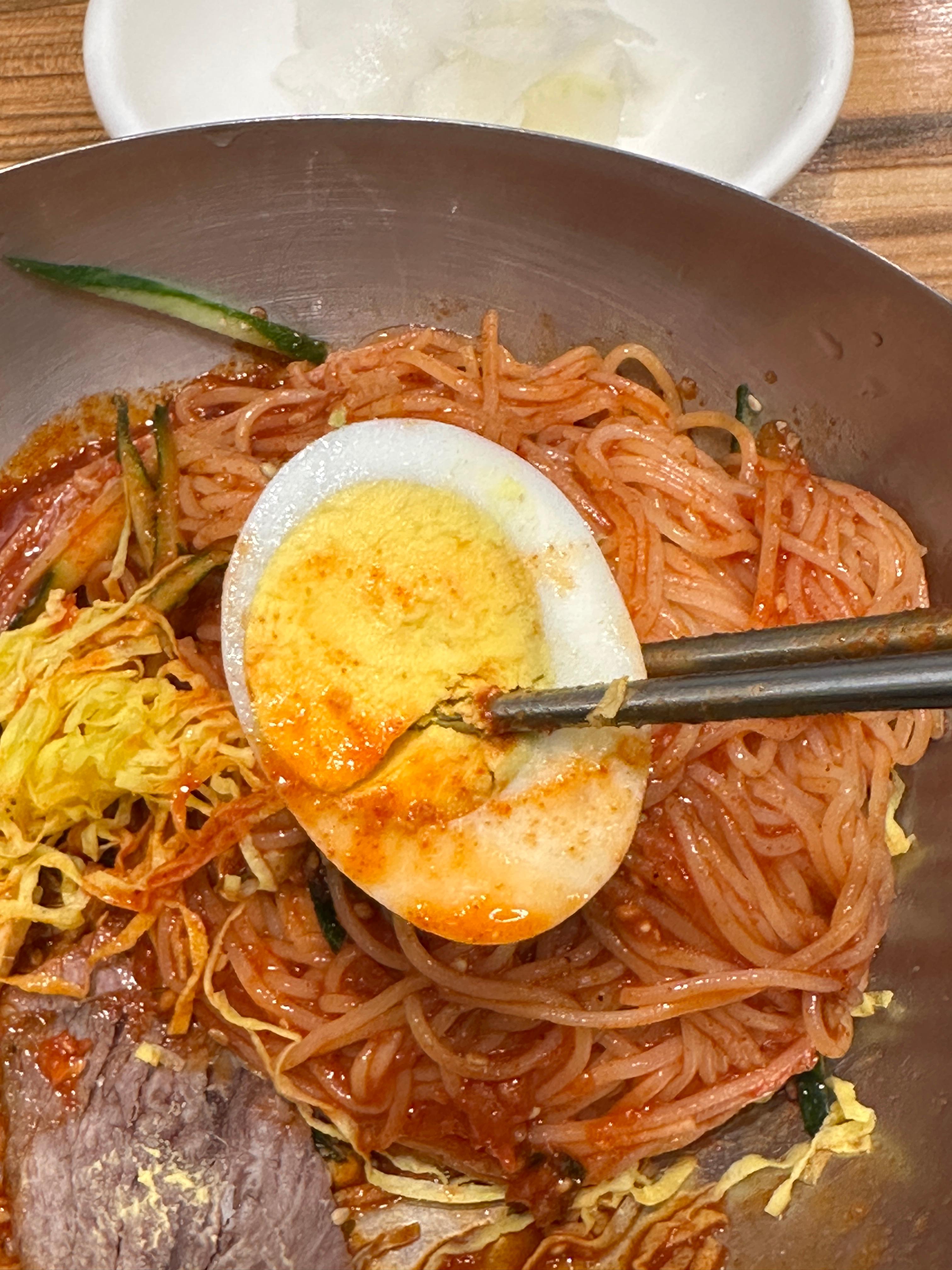 아차차 비비다가 계란을 먼저 먹는 게 좋다고, 밀면 냉면에 계란은 다 이유가 있는 거라고 어디서 본 거 같아서 다급한 마음으로