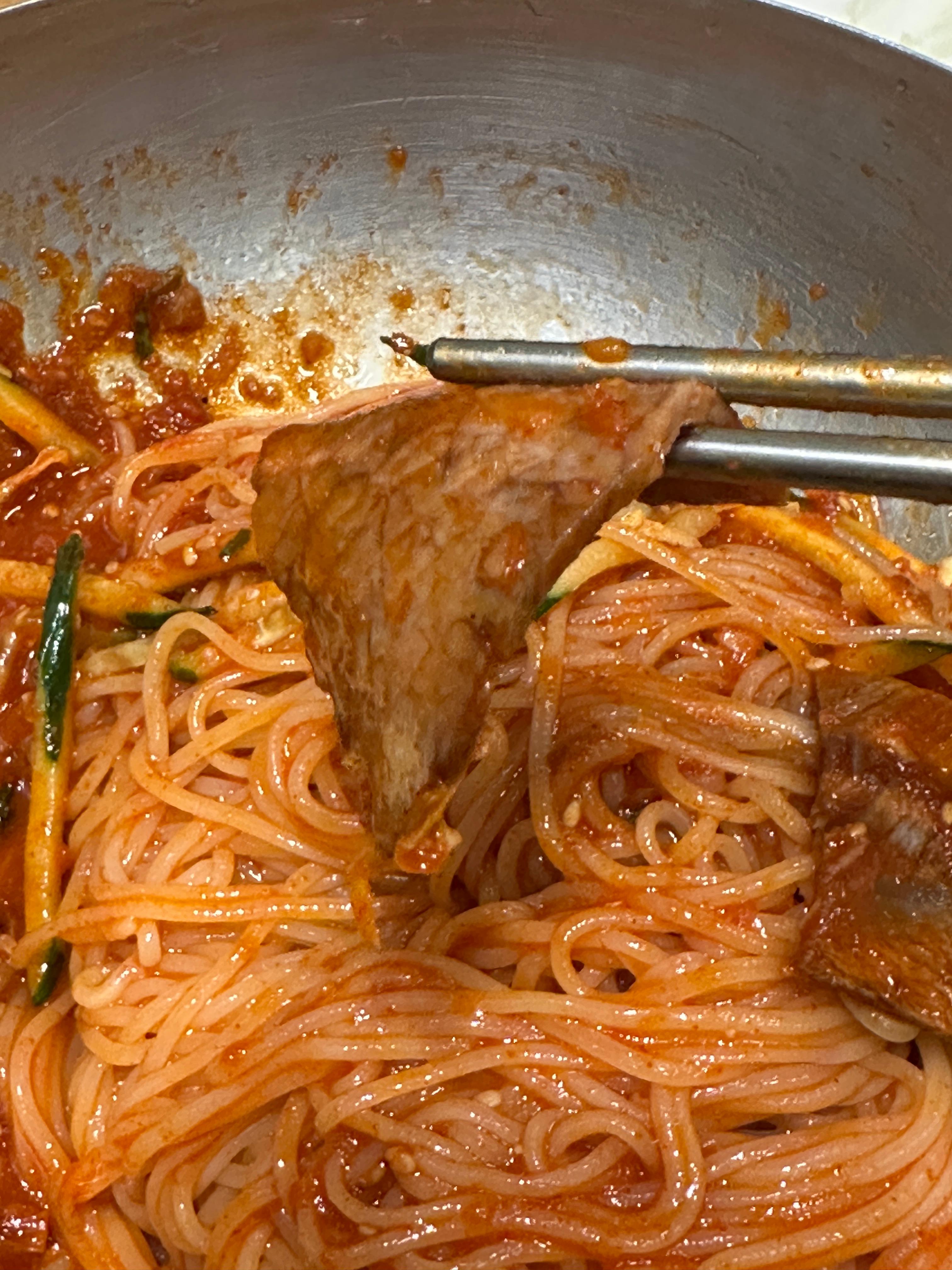 아~ 밀면 안에 들어있는고기가 질기면,