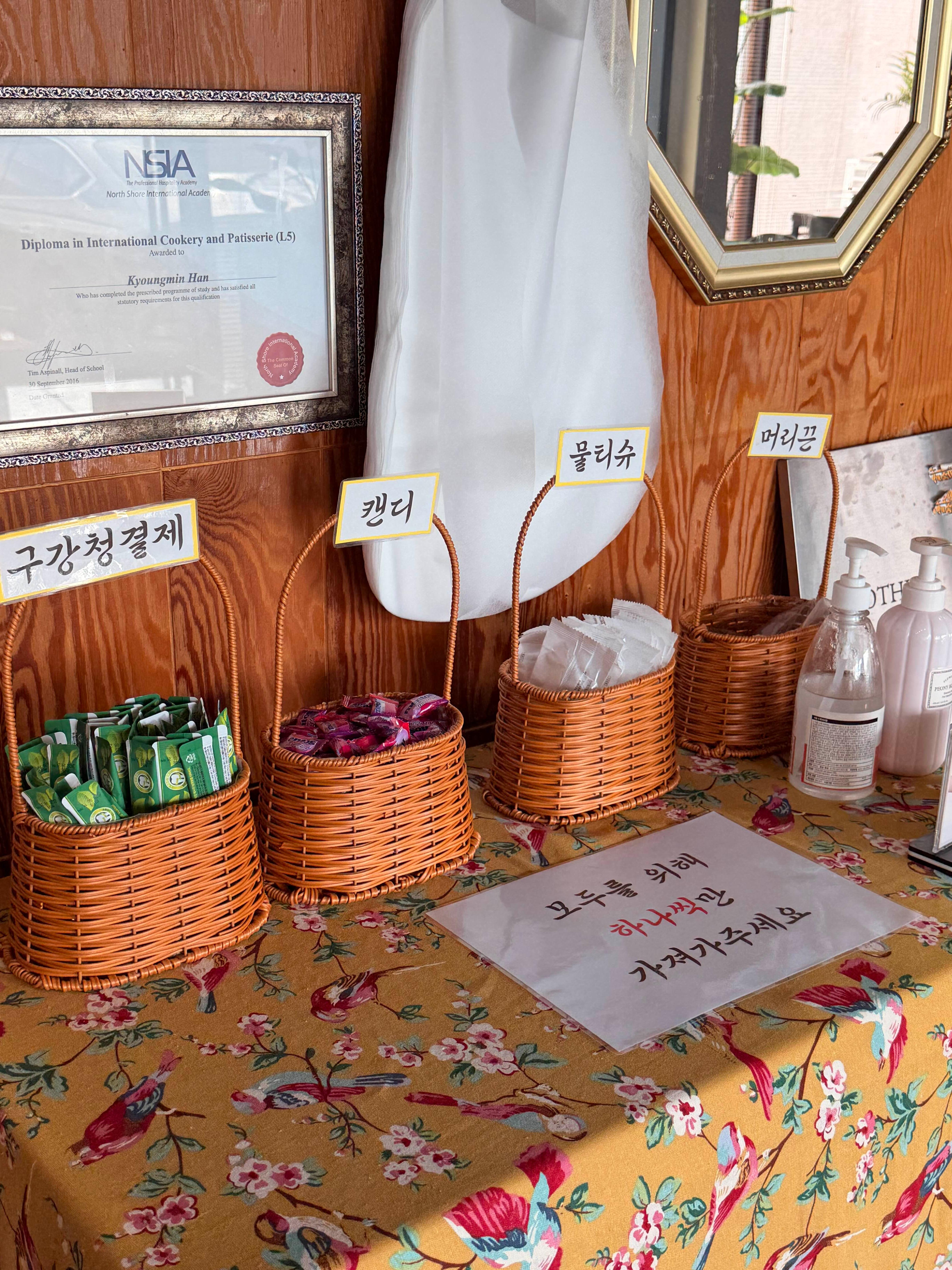 곰탕집에 구강청결제, 사탕, 물티슈, 앞지마,손소독 머리끈, 그리고 이쑤시개까지 ㅎ 한쪽에 모아두셨음~! ㅎ