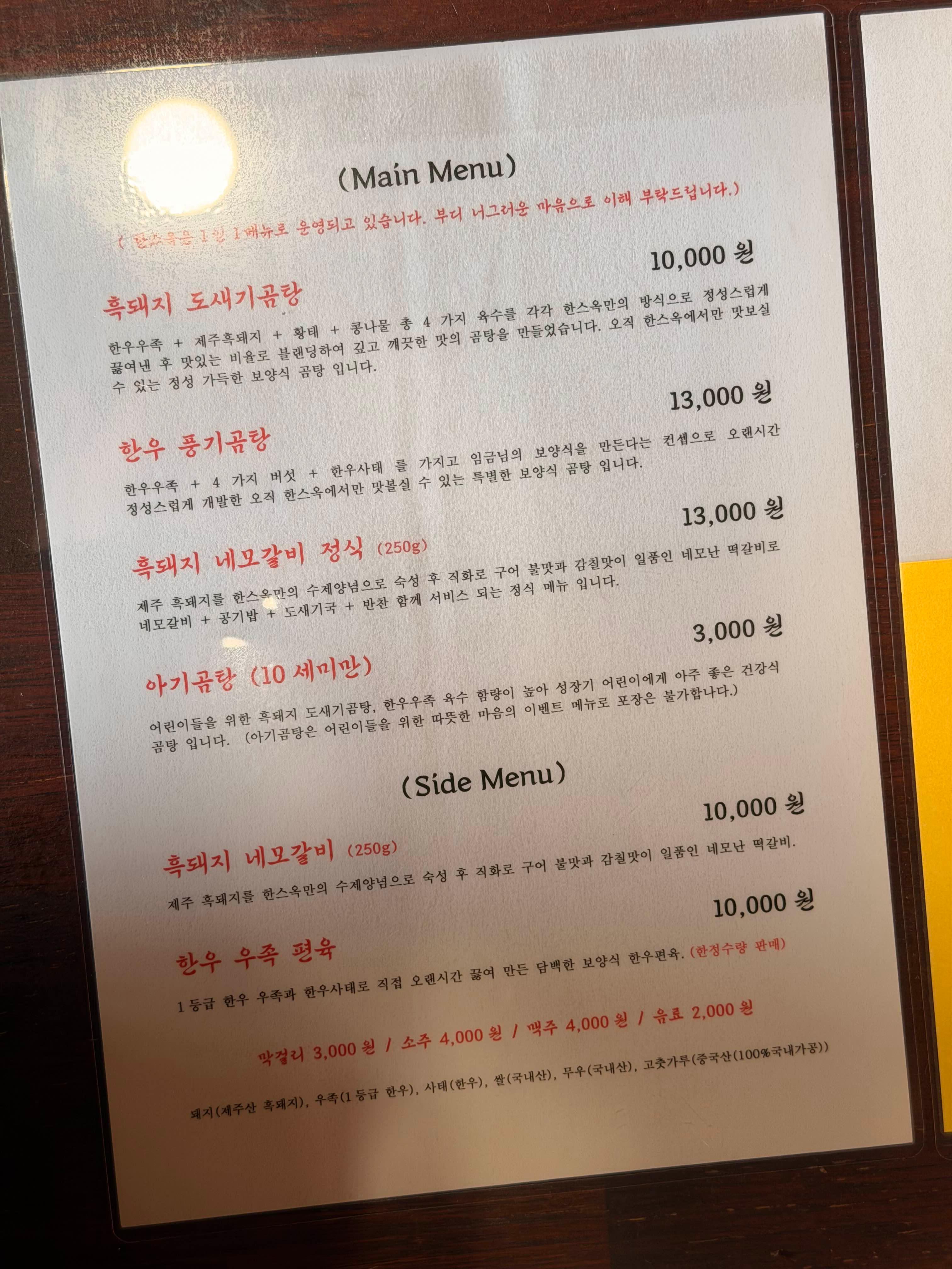 한스옥의 메뉴는 기본 흑돼지 도새기곰탕이 10,000원!
